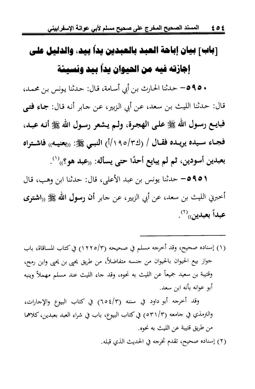5951 - حدثنا يونس بن عبد الأعلى، قال: حدثنا ابن وهب، قال أخبرني الليث بن سعد، عن أبي الزبير، عن جابر أن رسول الله صلى الله عليه وسلم "اشترى عبدًا بعبدين" (¬1).