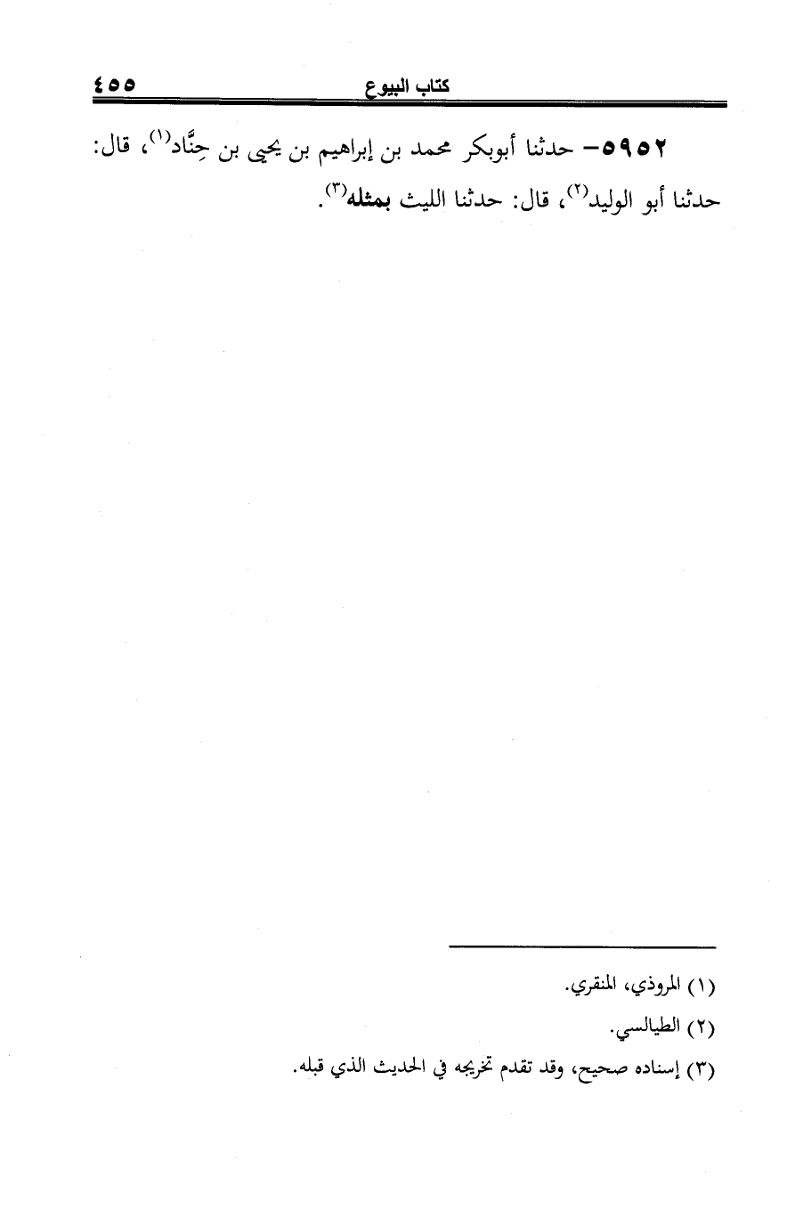 5952 - حدثنا أبو بكر محمد بن إبراهيم بن يحيى بن حِنَّاد (¬1) قال: حدثنا أبو الوليد (¬2)، قال: حدثنا الليث بمثله (¬3).