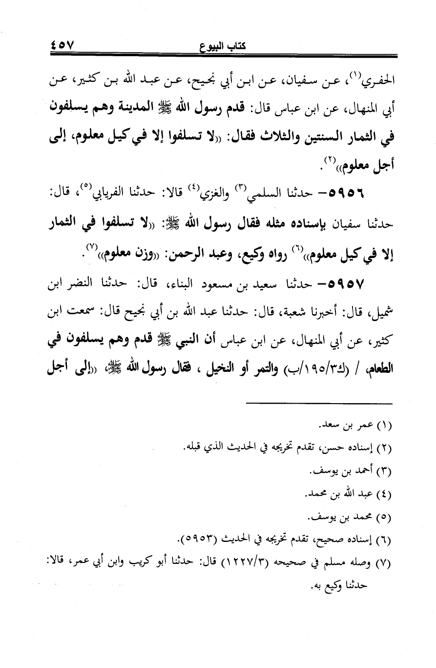 5956 - حدثنا السلمي (¬1) والغزي (¬2) قالا: حدثنا الفريابي (¬3)، قال: حدثنا سفيان بإسناده مثله فقال رسول الله صلى الله عليه وسلم: "لا تسلفوا في الثمار إلا في كيل معلوم" (¬4) رواه وكيع، وعبد الرحمن: "وزن معلوم" (¬5).