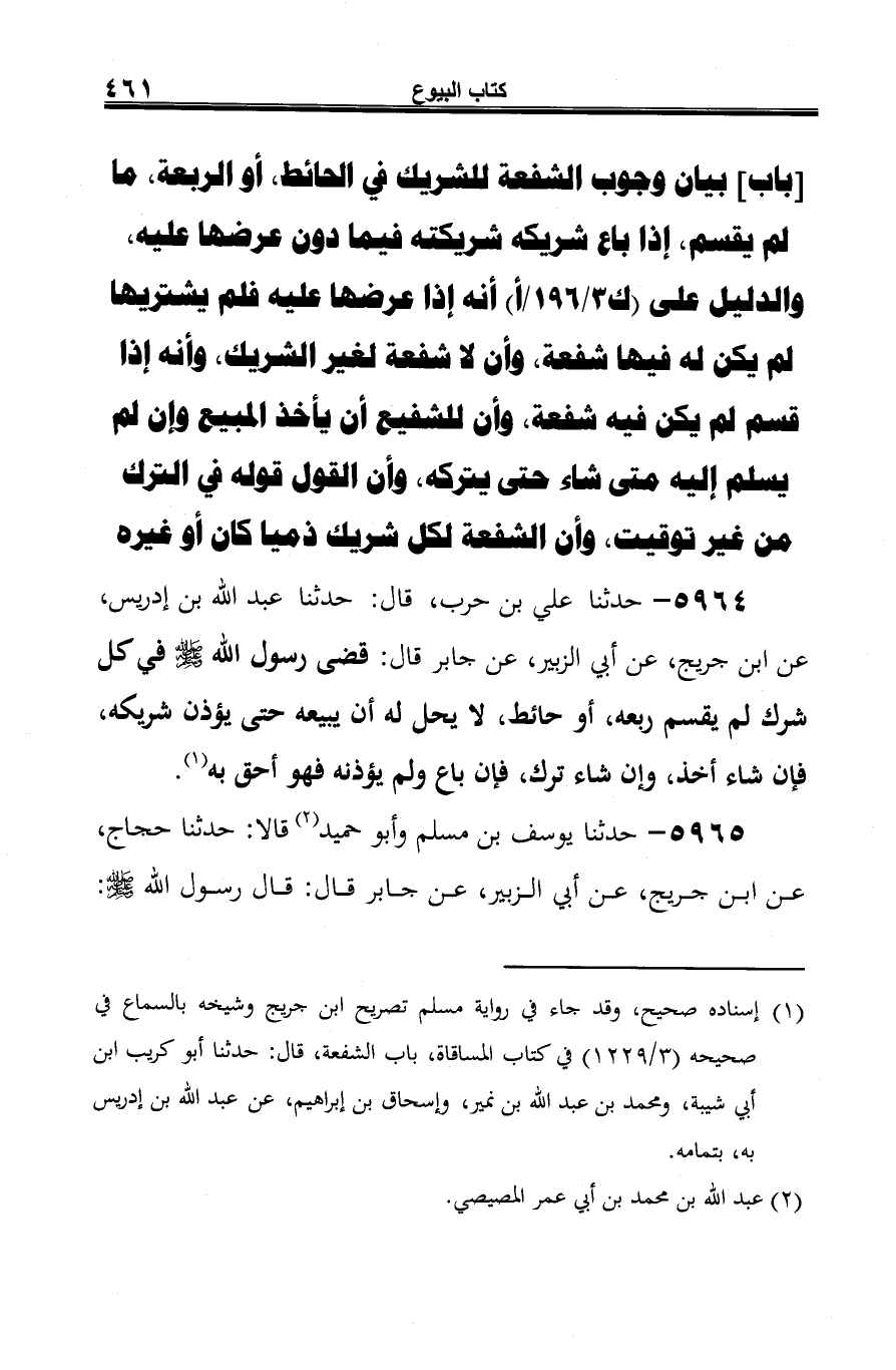 (¬1) إسناده صحيح، وقد جاء في رواية مسلم تصريح ابن جريج وشيخه بالسماع في صحيحه (3/ 1229) في كتاب المساقاة، باب الشفعة، قال: حدثنا أبو كريب ابن أبي شيبة، ومحمد بن عبد الله بن نمير، وإسحاق بن إبراهيم، عن عبد الله بن إدريس به، بتمامه.