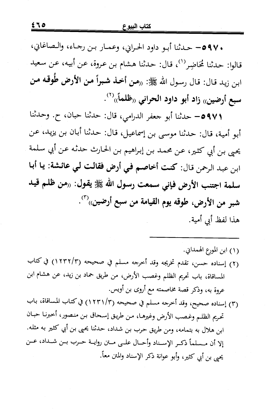 (¬1) إسناده صحيح، وقد أخرجه مسلم في صحيحه (3/ 1231) في كتاب المساقاة، باب تحريم الظلم وغصب الأرض وغيرها، من طريق إسحاق بن منصور، أخبرنا حبان ابن هلال به بتمامه، ومن طريق حرب بن شداد، حدثنا يحيى بن أبي كثير به مثله.