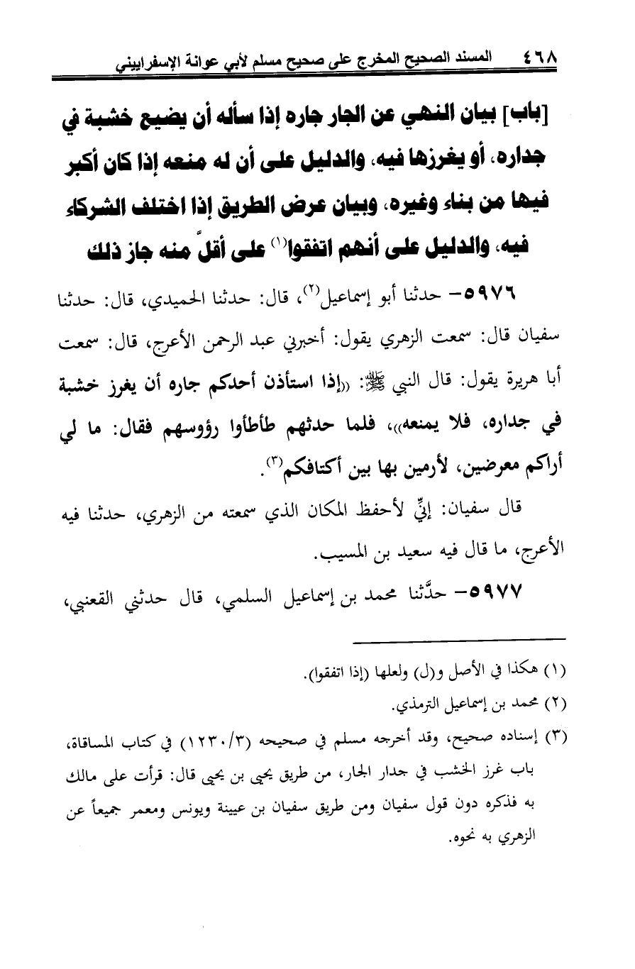 5976 - حدثنا أبو إسماعيل (¬1)، قال: حدثنا الحميدي، قال: حدثنا سفيان قال: سمعت الزهري يقول: أخبرني عبد الرحمن الأعرج، قال: سمعت أبا هريرة يقول: قال النبي صلى الله عليه وسلم: "إذا استأذن أحدكم جاره أن يغرز خشبة في جداره، فلا يمنعه"، فلما حدثهم طأطأوا رؤوسهم فقال: ما لي أراكم معرضين، لأرمين بها بين أكتافكم (¬2).