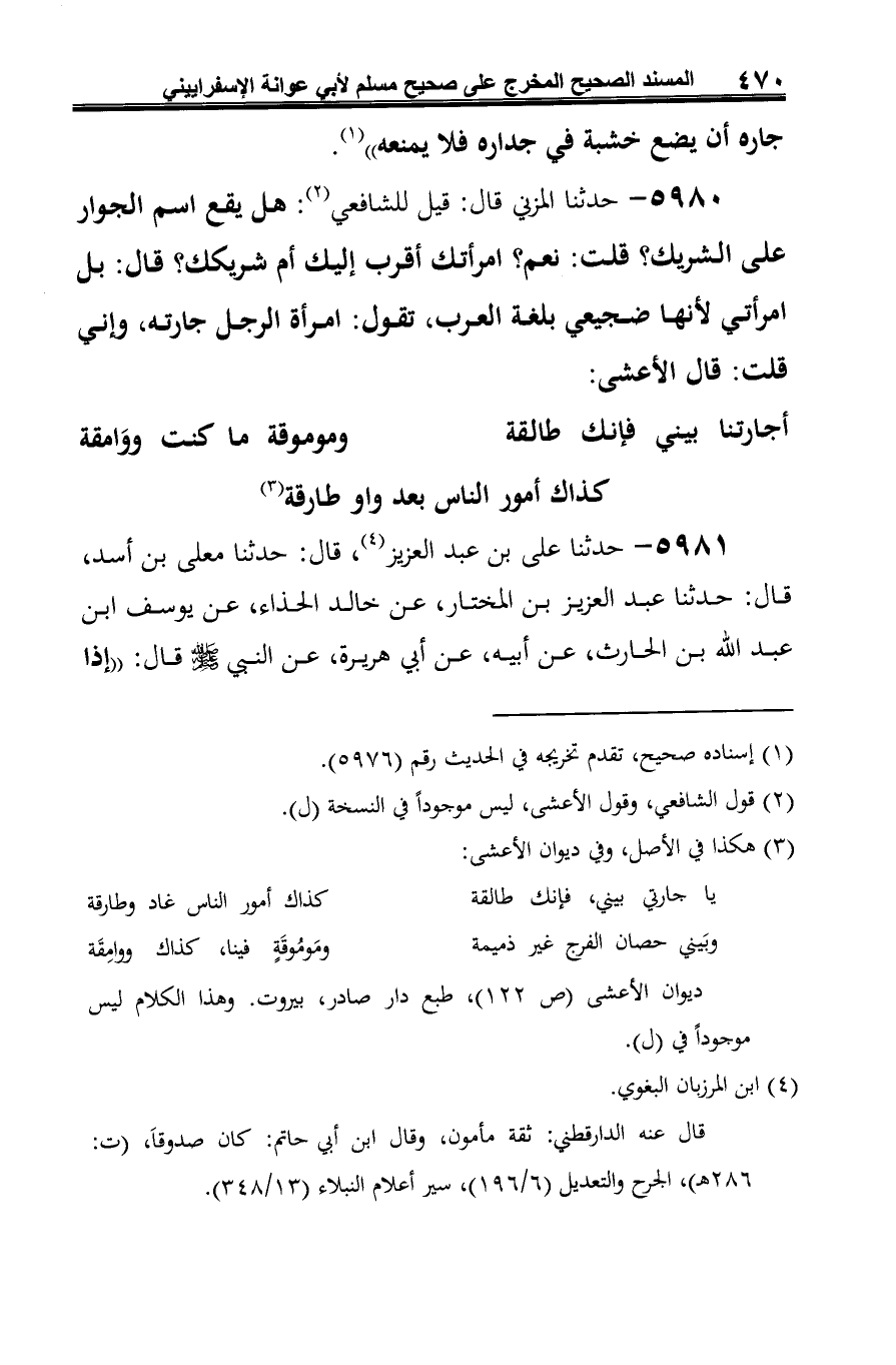 5980 - حدثنا المزني قال: قيل للشافعي (¬1): هل يقع اسم الجوار على الشريك؟ قلت: نعم؟ امرأتك أقرب إليك أم شريكك؟ قال: بل امرأتي لأنها ضجيعي بلغة العرب، تقول: امرأة الرجل جارته، وإني قلت: قال الأعشى: