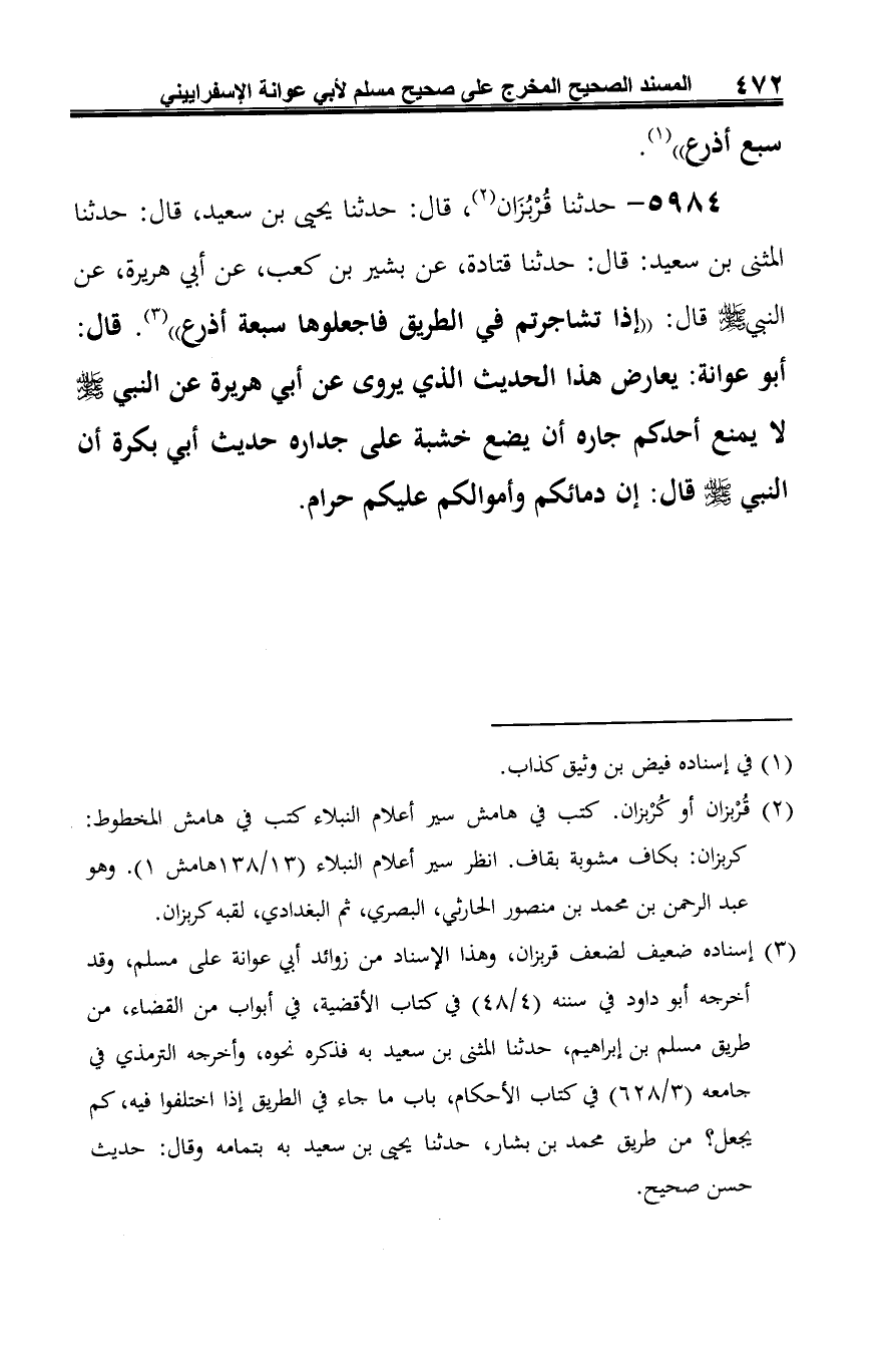 5984 - حدثنا قُرْبُزَان (¬1)، قال: حدثنا يحيى بن سعيد، قال: حدثنا المثنى بن سعيد: قال: حدثنا قتادة، عن بشير بن كعب، عن أبي هريرة، عن النبي صلى الله عليه وسلم قال: "إذا تشاجرتم في الطريق فاجعلوها سبعة أذرع" (¬2). قال: أبو عوانة: يعارض هذا الحديث الذي يروى عن أبي هريرة عن النبي صلى الله عليه وسلم لا يمنع أحدكم جاره أن يضع خشبة على جداره حديث أبي بكرة أن النبي صلى الله عليه وسلم قال: إن دمائكم وأموالكم عليكم حرام.