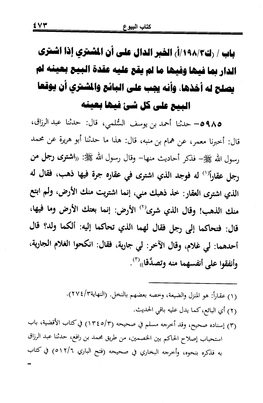 5985 - حدثنا أحمد بن يوسف السُّلمي، قال: حدثنا عبد الرزاق، قال: أخبرنا معمر، عن همام بن منبه، قال: هذا ما حدثنا أبو هريرة عن محمد رسول الله صلى الله عليه وسلم -فذكر أحاديث منها- وقال رسول الله صلى الله عليه وسلم: "اشترى رجل من رجل عقارًا (¬1) له فوجد الذي اشترى في عقاره جرة فيها ذهب، فقال له الذي اشترى العقار: خذ ذهبك مني، إنما اشتريت منك الأرض، ولم ابتع منك الذهب! وقال الذي شرى (¬2) الأرض: إنما بعتك الأرض وما فيها، قال: فتحاكما إلى رجل فقال لهما الذي تحاكما إليه: ألكما ولد؟ قال أحدهما: لي غلام، وقال الآخر: لي جارية، فقال: انكحوا الغلام الجارية، وأنفقوا على أنفسهما منه وتصدَّقا" (¬3).