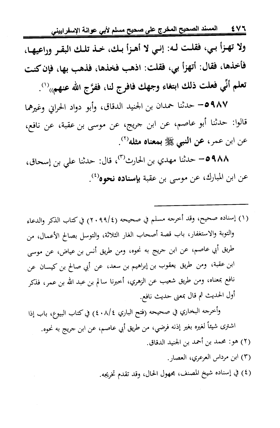 5987 - حدثنا حمدان بن الجنيد الدقاق، وأبو دواد الحراني وغيرهما قالوا: حدثنا أبو عاصم، عن ابن جريج، عن موسى بن عقبة، عن نافع، عن ابن عمر، عن النبي صلى الله عليه وسلم بمعناه مثله (¬1).