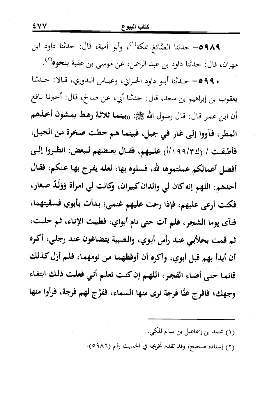 5990 - حدثنا أبو داود الحراني، وعباس الدوري، قالا: حدثنا يعقوب بن إبراهيم بن سعد، قال: حدثنا أبي، عن صالح، قال: أخبرنا نافع أن ابن عمر قال: قال رسول الله صلى الله عليه وسلم: "بينما ثلاثة رهط يمشون أخذهم المطر، فآووا إلى غار في جبل، فبينما هم حطت صخرة من الجبل، فأطبقت عليهم، فقال بعضهم لبعض: انظروا إلى أفضل أعمالكم عملتموها لله، فسلوه بها، لعله يفرج بها عنكم، فقال أحدهم: اللهم إنه كان لي والدان كبيران، وكانت لي امرأة وَوَلَدٌ صغار، فكنت أرعى عليهم، فإذا رحت عليهم غنمي، بدأت بأبوي فسقيتهما، فنآى يوما الشجر، فلم آت حتى نام أبواي، فطيبت الإناء، ثم حلبت، ثم قمت بحلأبي عند رأس أبوي، والصبية يتضاغون عند رجلي، أكره أن أبدأ بهم قبل أبوي، وأكره أن أوقظهما من نومهما، فلم أزل كذلك قائما حتى أضاء الفجر، اللهم إن كنت تعلم أني فعلت ذلك ابتغاء وجهك؛ فافرج عنَّا فرجة نرى منها السماء، ففرَّج لهم فرجة، فرأوا منها
