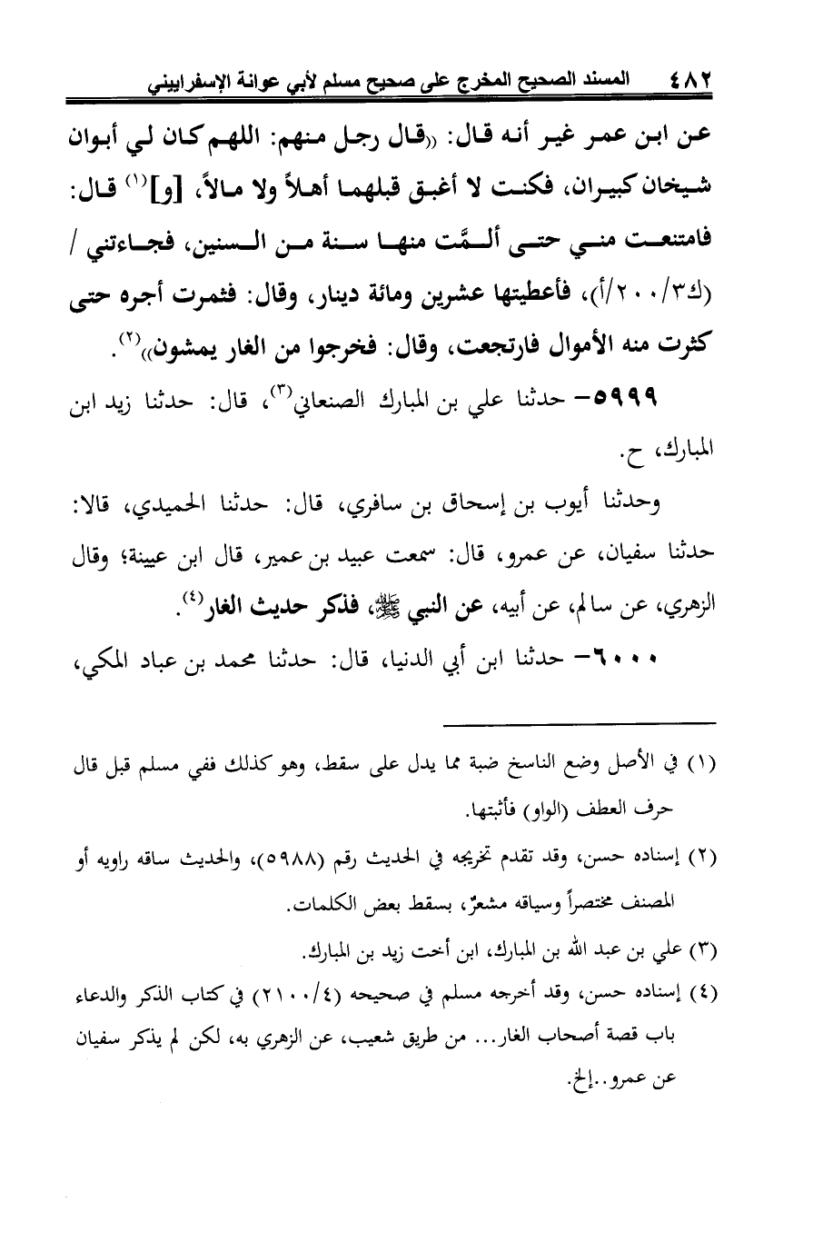 (¬2) إسناده حسن، وقد أخرجه مسلم في صحيحه (4/ 2100) في كتاب الذكر والدعاء باب قصة أصحاب الغار ... من طريق شعيب، عن الزهري به، لكن لم يذكر سفيان عن عمرو .. إلخ.