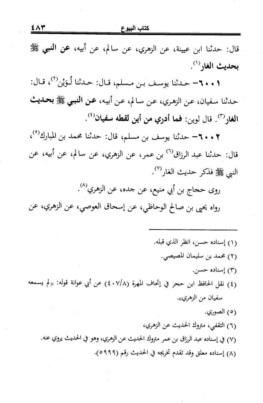 6001 - حدثنا يوسف بن مسلم، قال: حدثنا لُوَيْن (¬1)، قال: حدثنا سفيان، عن الزهري، عن سالم، عن أبيه، عن النبي صلى الله عليه وسلم بحديث الغار (¬2). قال لوين: فما أدري من أين لقطه سفيان (¬3).