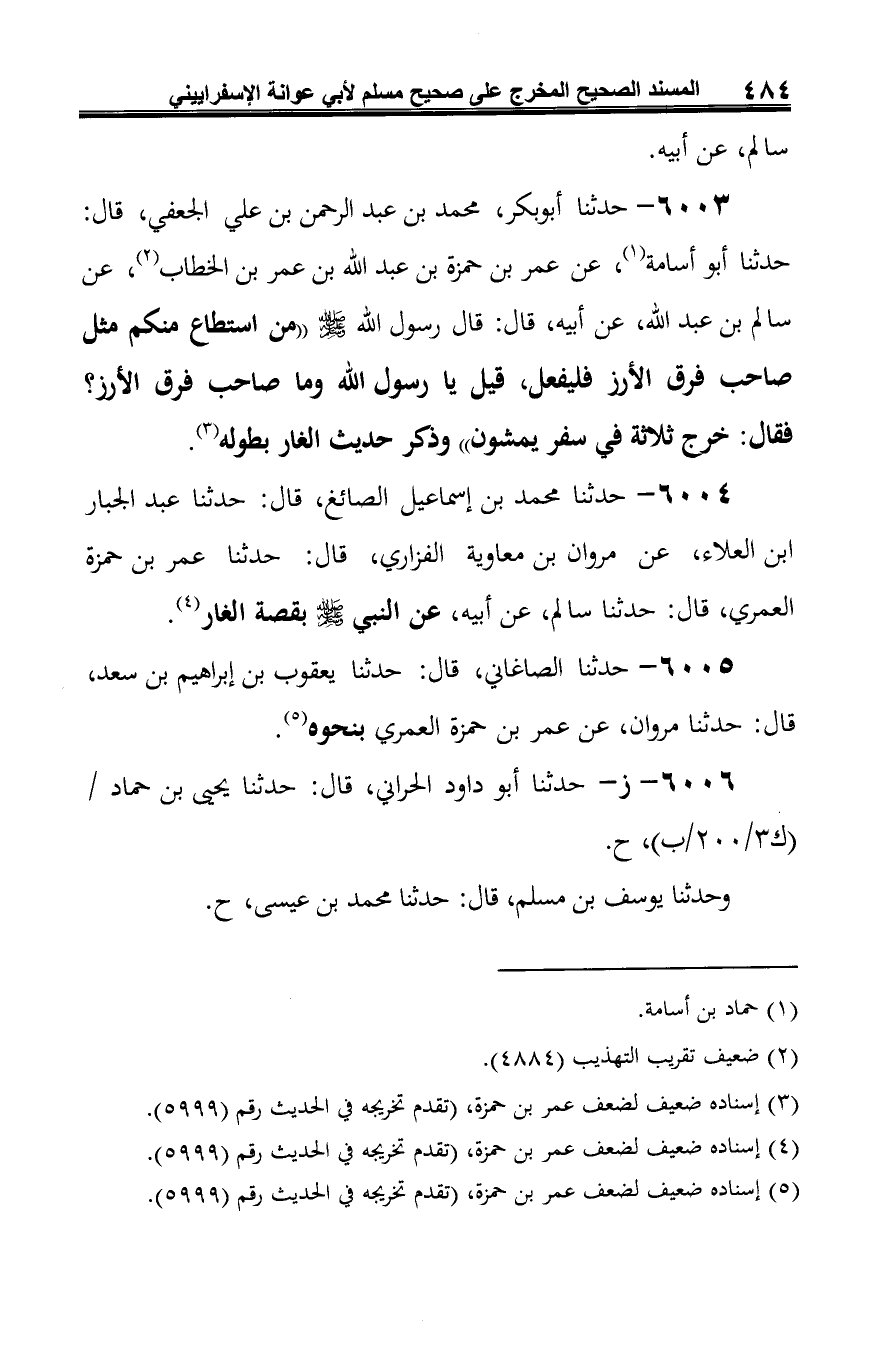 6005 - حدثنا الصاغاني، قال: حدثنا يعقوب بن إبراهيم بن سعد، قال: حدثنا مروان، عن عمر بن حمزة العمري بنحوه (¬1).