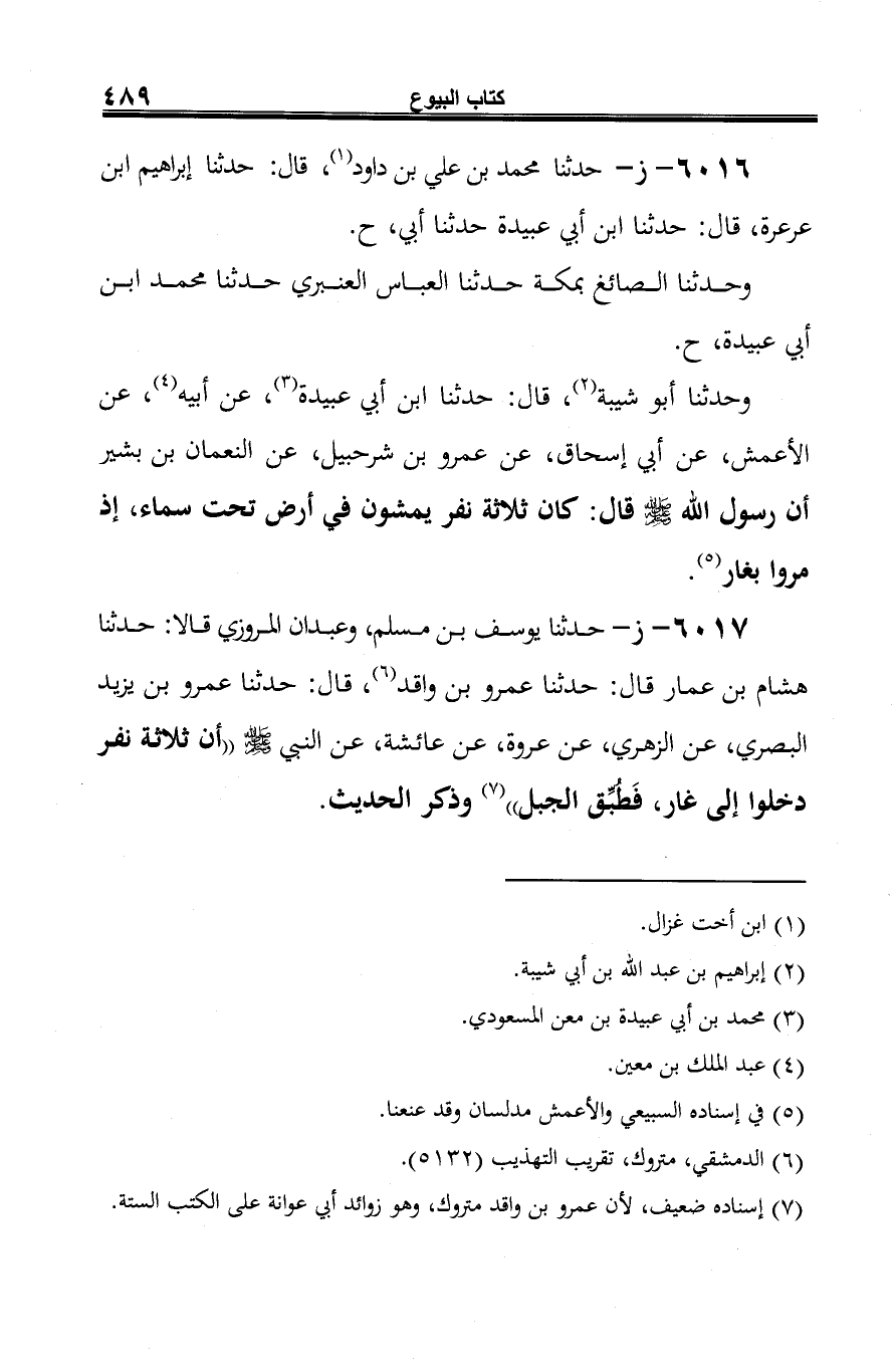 وحدثنا أبو شيبة (¬2)، قال: حدثنا ابن أبي عبيدة (¬3)، عن أبيه (¬4)، عن الأعمش، عن أبي إسحاق، عن عمرو بن شرحبيل، عن النعمان بن بشير أن رسول الله صلى الله عليه وسلم قال: كان ثلاثة نفر يمشون في أرض تحت سماء، إذ مروا بغار (¬5).