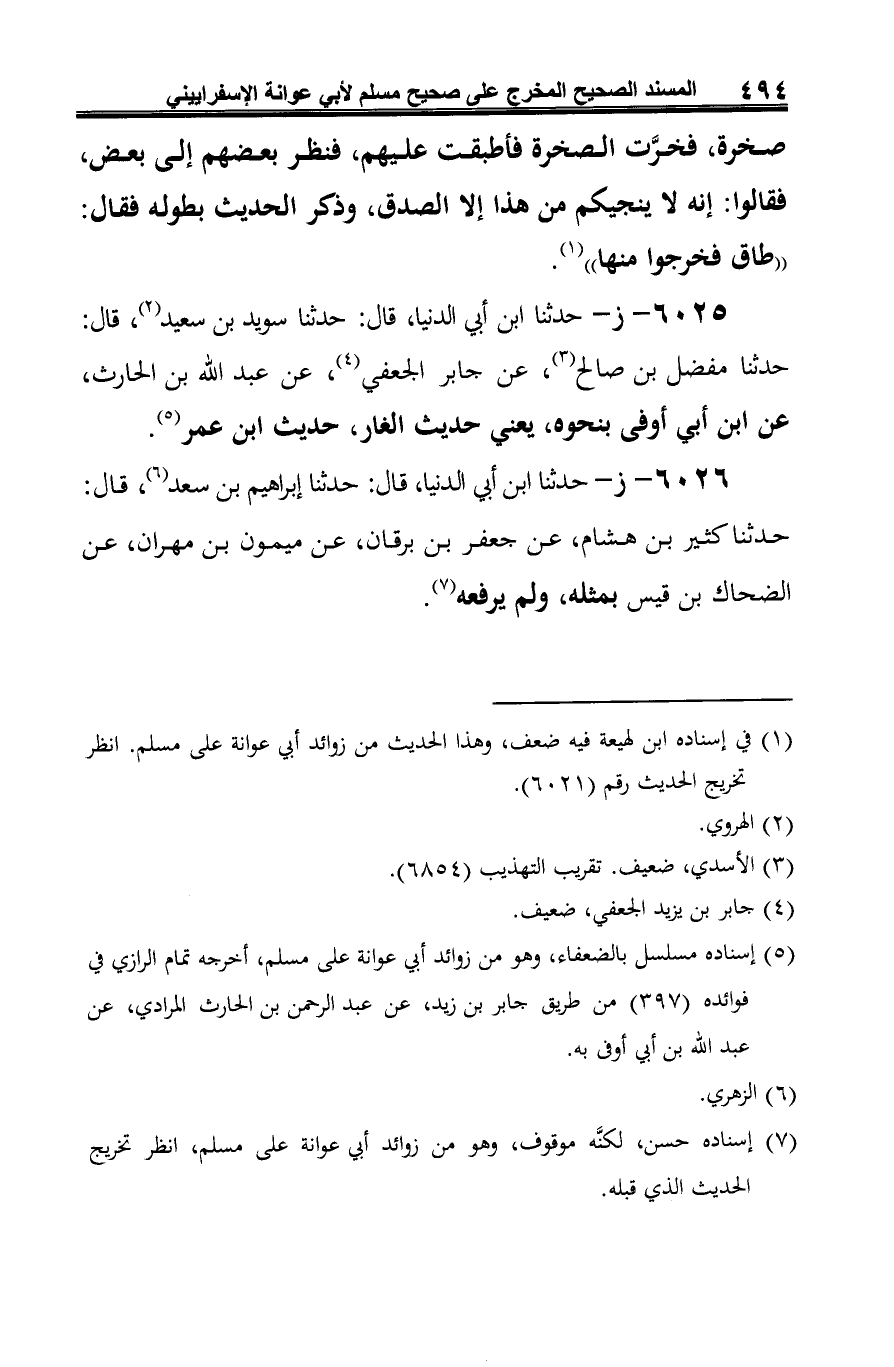 6025 - ز - حدثنا ابن أبي الدنيا، قال: حدثنا سويد بن سعيد (¬1)، قال: حدثنا مفضل بن صالح (¬2)، عن جابر الجعفي (¬3)، عن عبد الله بن الحارث، عن ابن أبي أوفى بنحوه، يعني حديث الغار، حديث ابن عمر (¬4).