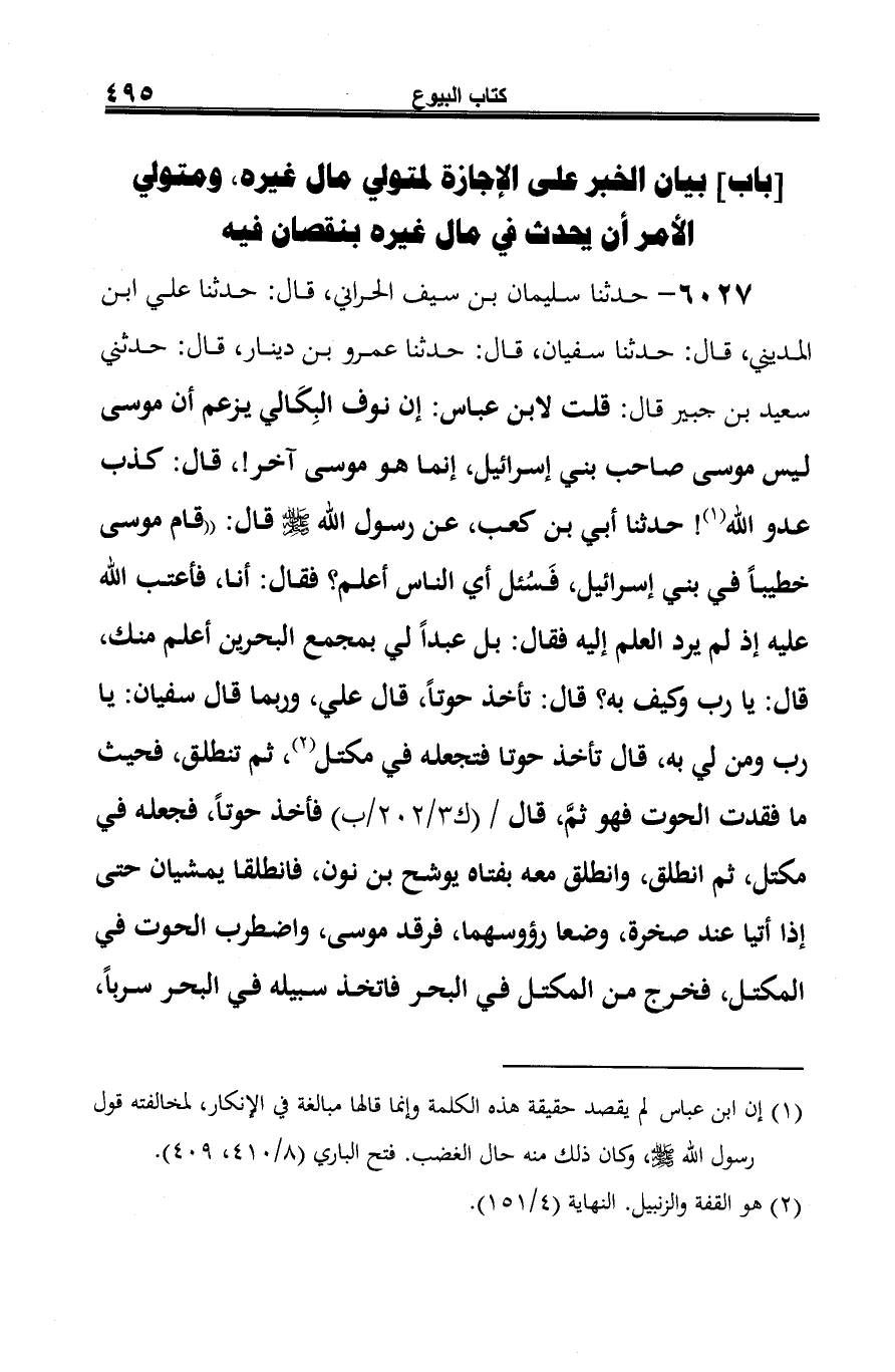 6027 - حدثنا سليمان بن سيف الحراني، قال: حدثنا علي ابن المديني، قال: حدثنا سفيان، قال: حدثنا عمرو بن دينار، قال: حدثني سعيد بن جبير قال: قلت لابن عباس: إن نوف البِكَالي يزعم أن موسى ليس موسى صاحب بني إسرائيل، إنما هو موسى آخر!، قال: كذب عدو الله (¬1)! حدثنا أبي بن كعب، عن رسول الله صلى الله عليه وسلم قال: "قام موسى خطيبًا في بني إسرائيل، فَسُئل أي الناس أعلم؟ فقال: أنا، فأعتب الله عليه إذ لم يرد العلم إليه فقال: بل عبدًا لي بمجمع البحرين أعلم منك، قال: يا رب وكيف به؟ قال: تأخذ حوتًا، قال علي، وربما قال سفيان: يا رب ومن لي به، قال تأخذ حوتا فتجعله في مكتل (¬2)، ثم تنطلق، فحيث ما فقدت الحوت فهو ثمَّ، قال فأخذ حوتًا، فجعله في مكتل، ثم انطلق، وانطلق معه بفتاه يوشح بن نون، فانطلقا يمشيان حتى إذا أتيا عند صخرة، وضعا رؤوسهما، فرقد موسى، واضطرب الحوت في المكتل، فخرج من المكتل في البحر فاتخذ سبيله في البحر سربًا،
