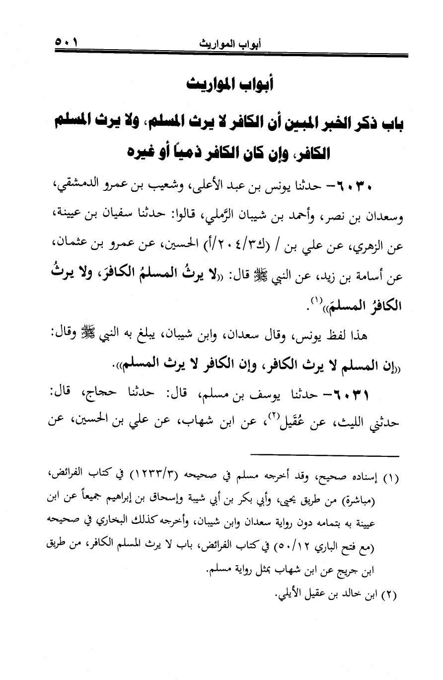 6030 - حدثنا يونس بن عبد الأعلى، وشعيب بن عمرو الدمشقي، وسعدان بن نصر، وأحمد بن شيبان الرَّملي، قالوا: حدثنا سفيان بن عيينة، عن الزهري، عن علي بن الحسين، عن عمرو بن عثمان، عن أسامة بن زيد، عن النبي -صلى الله عليه وسلم- قال: "لا يرثُ المسلمُ الكافرَ، ولا يرثُ الكافرُ المسلمَ" (¬1).