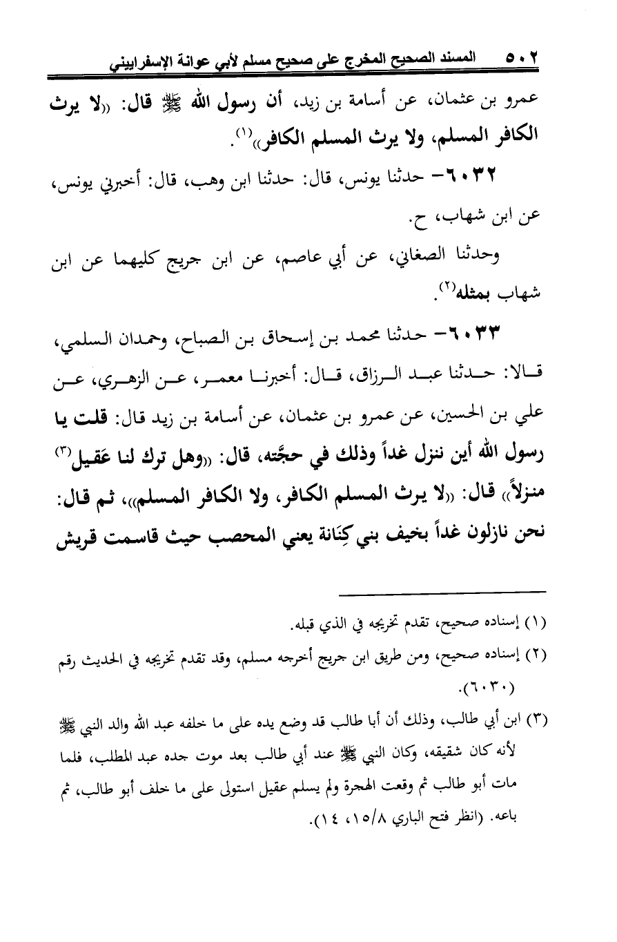 6033 - حدثنا محمد بن إسحاق بن الصباح، وحمدان السلمي، قالا: حدثنا عبد الرزاق، قال: أخبرنا معمر، عن الزهري، عن علي بن الحسين، عن عمرو بن عثمان، عن أسامة بن زيد قال: قلت يا رسول الله أين ننزل غدًا وذلك في حجَّته، قال: "وهل ترك ك عَقيل (¬1) منزلًا" قال: "لا يرث المسلم الكافر، ولا الكافر المسلم"، ثم قال: نحن نازلون غدًا بخيف بني كِنَانة يعني المحصب حيث قاسمت قريش
