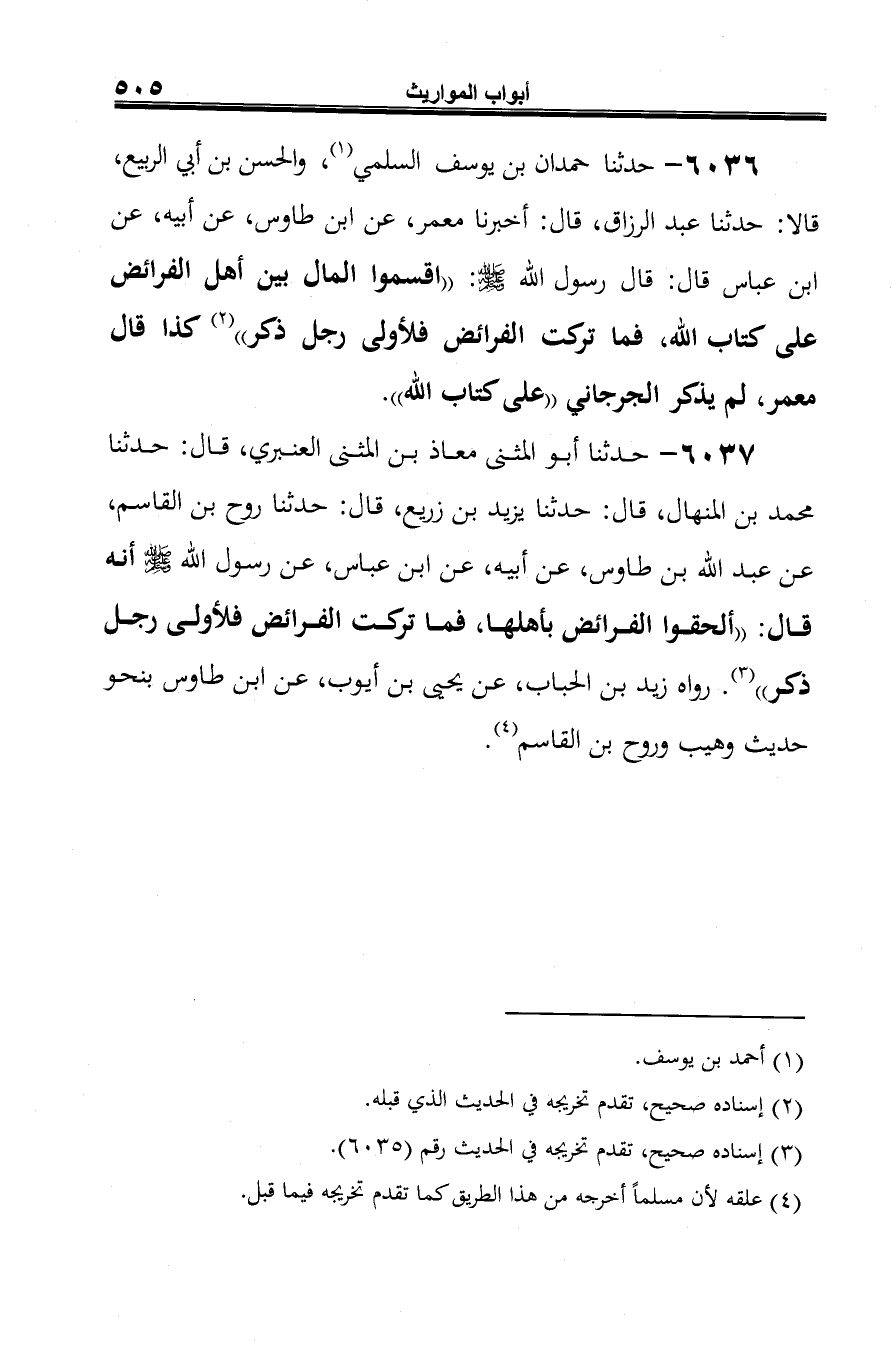 6037 - حدثنا أبو المثنى معاذ بن المثنى العنبري، قال: حدثنا محمد بن المنهال، قال: حدثنا يزيد بن زريع، قال: حدثنا روح بن القاسم، عن عبد الله بن طاوس، عن أبيه، عن ابن عباس، عن رسول الله -صلى الله عليه وسلم- أنه قال: "ألحقوا الفرائض بأهلها، فما تركت الفرائض فلأولى رجل ذكر" (¬1). رواه زيد بن الحباب، عن يحيى بن أيوب، عن ابن طاوس بنحو حديث وهيب وروح بن القاسم (¬2).