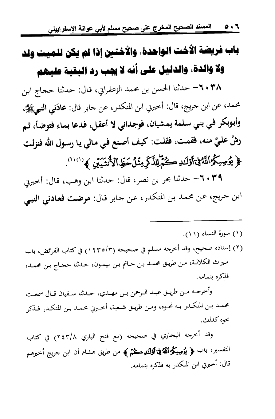 6038 - حدثنا الحسن بن محمد الزعفراني، قال: حدثنا حجاج ابن محمد، عن ابن جريج، قال: أخبرني ابن المنكدر، عن جابر قال: عادَني النبي - صلى الله عليه وسلم -، وأبو بكر في بني سلمة يمشيان، فوجداني لا أعقل، فدعا بماء فتوضأ، ثم رشَّ عليَّ منه، فقمت، فقلت: كيف أصنع في مالي يا رسول الله فنزلت {يُوصِيكُمُ اللَّهُ في أَوْلَادِكُمْ لِلذَّكَرِ مِثْلُ حَظِّ الْأُنْثَيَيْنِ} (¬1) (¬2).