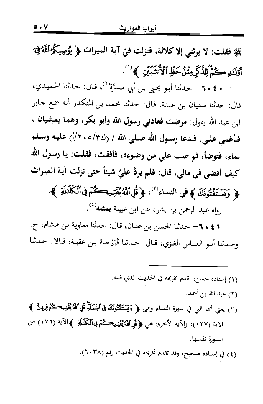 6040 - حدثنا أبو يحيى بن أبي مسرَّة (¬1)، قال: حدثنا الحميدي، قال: حدثنا سفيان بن عيينة، قال: حدثنا محمد بن المنكدر أنه سمع جابر ابن عبد الله يقول: مرضت فعادني رسول الله وأبو بكر، وهما يمشيان، فأغمي علي، فدعا رسول الله صلى الله عليه وسلم بماء، فتوضأ، ثم صب علي من وضوءه، فأفقت، فقلت: يا رسول الله كيف أقضي في مالي، قال: فلم يردَّ عليَّ شيئًا حتى نزلت آية الميراث {وَيَسْتَفْتُونَكَ} في النساء (¬2)، {قُلِ اللَّهُ يُفْتِيكُمْ في الْكَلَالَةِ}.