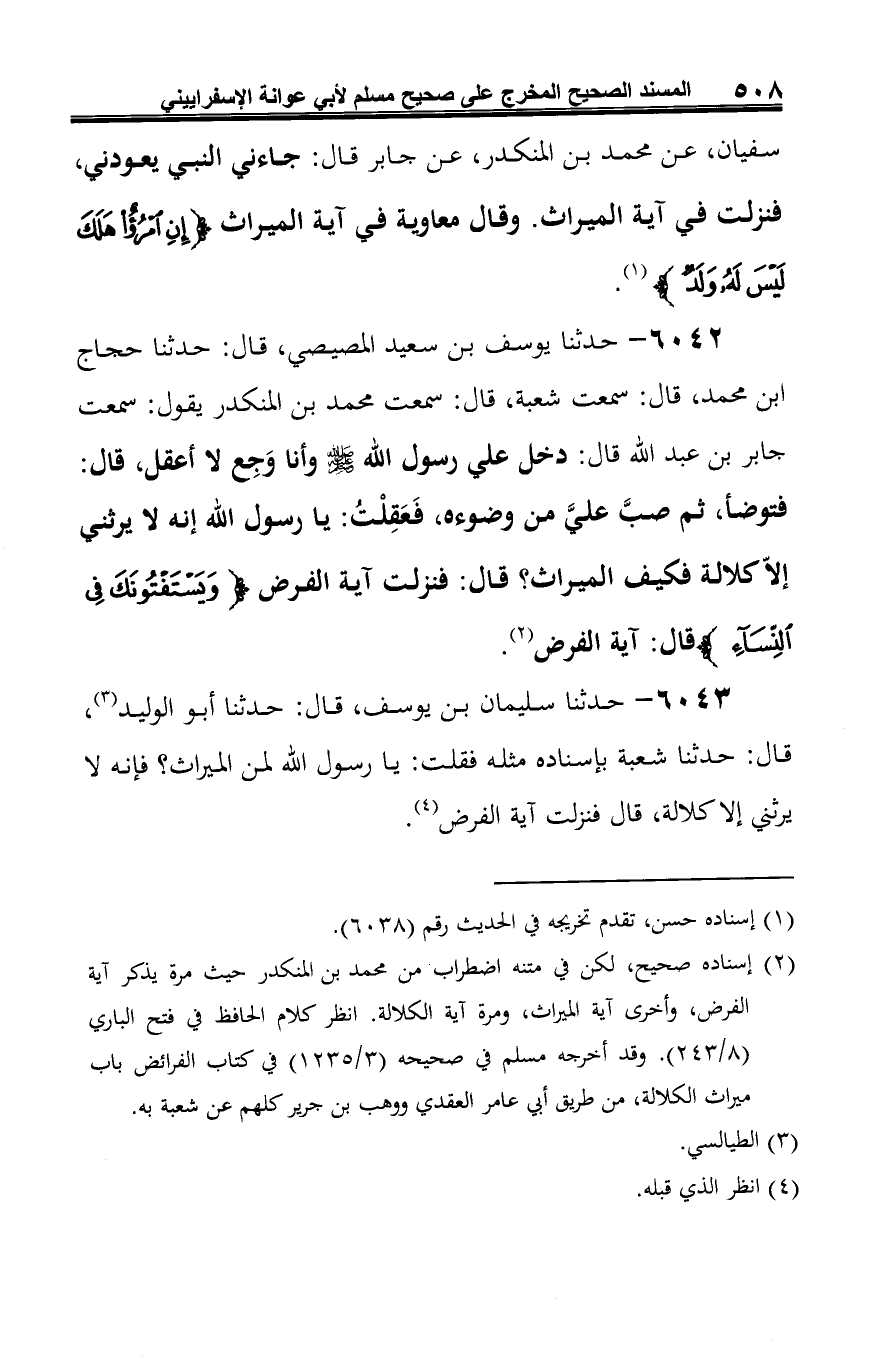 6042 - حدثنا يوسف بن سعيد المصيصي، قال: حدثنا حجاج ابن محمد، قال: سمعت شعبة، قال: سمعت محمد بن المنكدر يقول: سمعت جابر بن عبد الله قال: دخل علي رسول الله صلى الله عليه وسلم وأنا وَجِع لا أعقل، قال: فتوضأ، ثم صبَّ عليَّ من وضوءه، فَعَقِلْتُ: يا رسول الله إنه لا يرثني إلّا كلالة فكيف الميراث؟ قال: فنزلت آية الفرض {وَيَسْتَفْتُونَكَ في النِّسَاءِ} قال: آية الفرض (¬1).