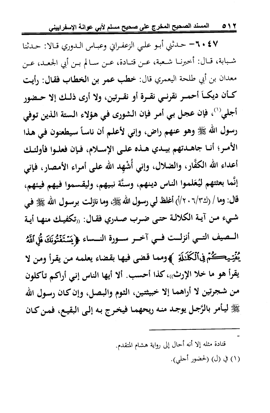 6047 - حدثني أبو علي الزعفراني وعباس الدوري قالا: حدثنا شبابة، قال: أخبرنا شعبة، عن قتادة، عن سالم بن أبي الجعد، عن معدان بن أبي طلحة اليعمري قال: خطب عمر بن الخطاب فقال: رأيت كأن ديكًا أحمر نقرني نقرة أو نقرتين، ولا أرى ذلك إلا حضور أجلي (¬1)، فإن عجل بي أمر فإن الشورى في هؤلاء الستة الذين توفي رسول الله صلى الله عليه وسلم وهو عنهم راض، وإني لأعلم أن ناسًا سيطعنون في هذا الأمر؛ أنا جاهدتهم بيدي هذه على الإسلام، فإن فعلوا فأولئك أعداء الله الكفَّار، والضلال، وإني أُشْهِد الله على أمراء الأمصار، فإني إنَّما بعثتهم ليُعَلموا الناس دينهم، وسنَّة نبيهم، وليقسموا فيهم فيئهم، قال: وما أغلظ لي رسول الله صلى الله عليه وسلم، وما نازلت برسول الله صلى الله عليه وسلم في شيء من آية الكلالة حتى ضرب صدري فقال: "تكفيك منها آية الصيف التي أنزلت في آخر سورة النساء {يَسْتَفْتُونَكَ قُلِ اللَّهُ يُفْتِيكُمْ في الْكَلَالَةِ} ومما قضى فيها بقضاء يعلمه من يقرأ ومن لا يقرأ هو ما خلا الإرث"، كذا أحسب. ألا أيها الناس إني أراكم تأكلون من شجرتين لا أراهما إلا خبيثتين، الثوم والبصل، وإن كان رسول الله -صلى الله عليه وسلم- ليأمر بالرَّجل يوجد منه ريحهما فيخرج به إلى البقيع، فمن كان