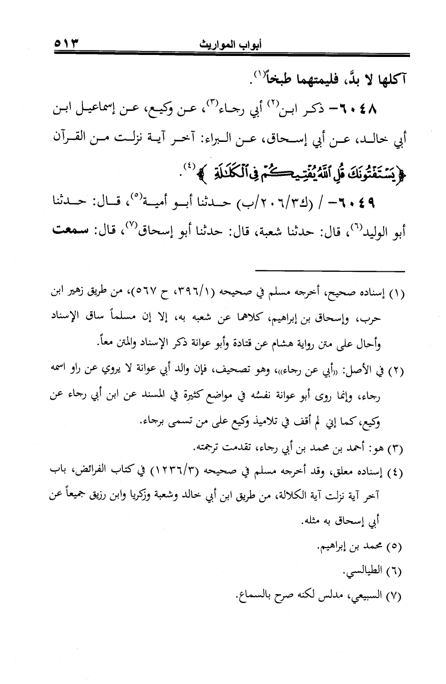 6048 - ذكر ابن (¬1) أبي رجاء (¬2)، عن وكيع، عن إسماعيل ابن أبي خالد، عن أبي إسحاق، عن البراء: آخر آية نزلت من القرآن {يَسْتَفْتُونَكَ قُلِ اللَّهُ يُفْتِيكُمْ في الْكَلَالَةِ} (¬3).