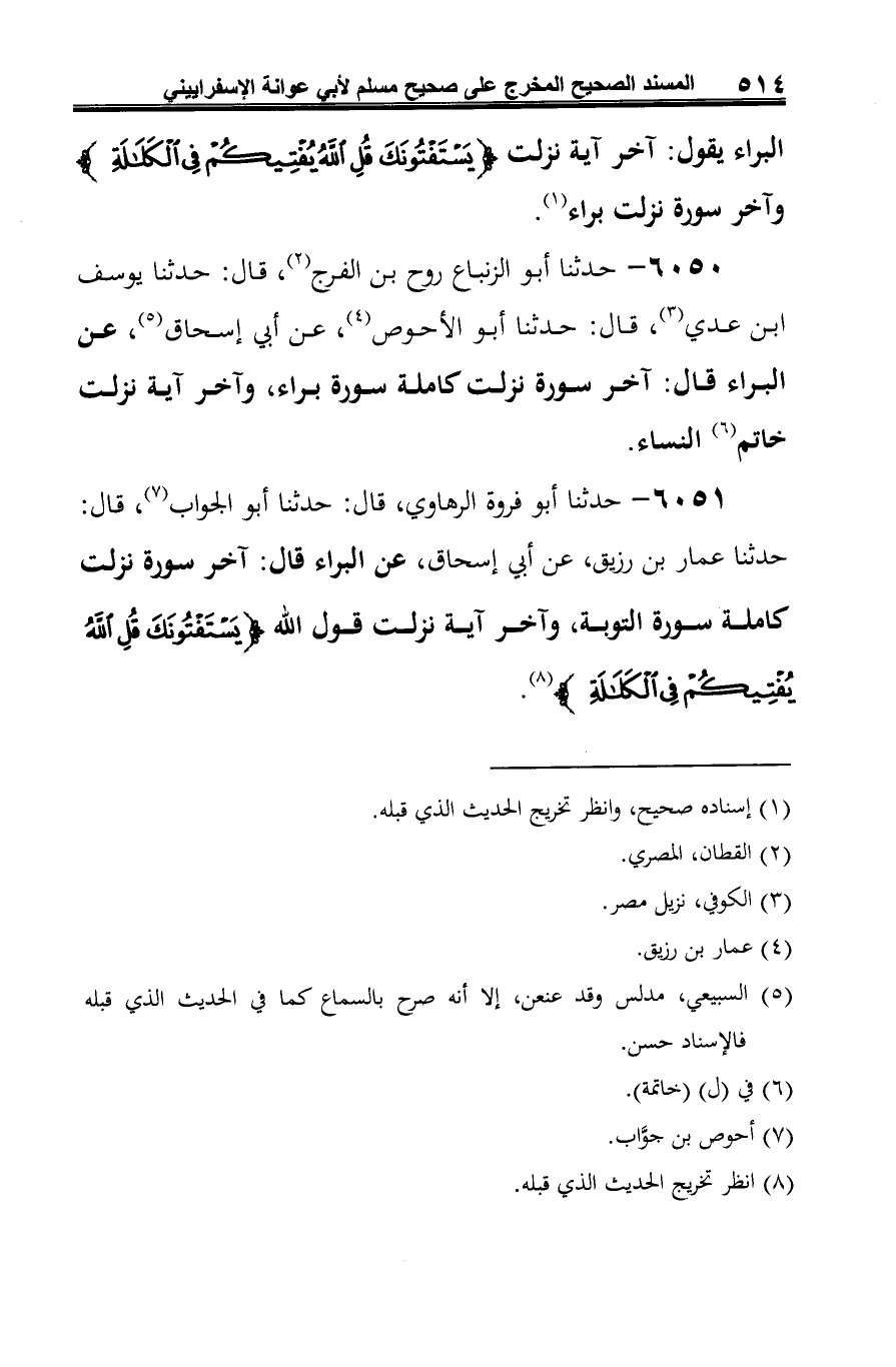 6050 - حدثنا أبو الزنباع روح بن الفرج (¬1)، قال: حدثنا يوسف ابن عدي (¬2)، قال: حدثنا أبو الأحوص (¬3)، عن أبي إسحاق (¬4)، عن البراء قال: آخر سورة نزلت كاملة سورة براء، وآخر آية نزلت خاتم (¬5) النساء.