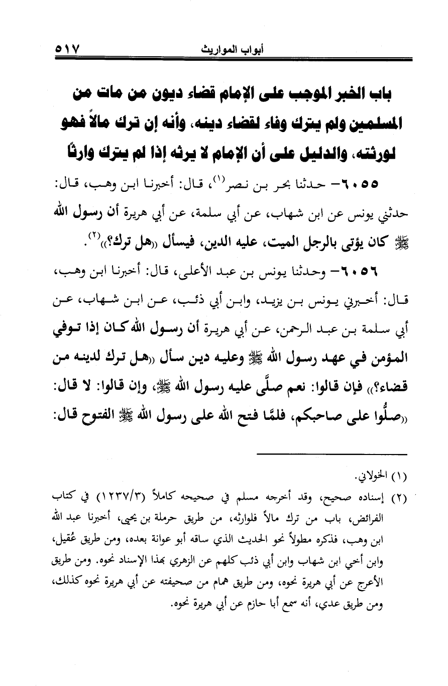 6056 - وحدثنا يونس بن عبد الأعلى، قال: أخبرنا ابن وهب، قال: أخبرني يونس بن يزيد، وابن أبي ذئب، عن ابن شهاب، عن أبي سلمة بن عبد الرحمن، عن أبي هريرة أن رسول الله كان إذا توفي المؤمن في عهد رسول الله صلى الله عليه وسلم وعليه دين سأل "هل ترك لدينه من قضاء؟ " فإن قالوا: نعم صلَّى عليه رسول الله صلى الله عليه وسلم، وإن قالوا: لا قال: "صلُّوا على صاحبكم، فلمَّا فتح الله على رسول الله صلى الله عليه وسلم الفتوح قال: