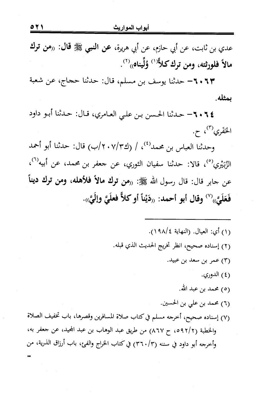 وحدثنا العباس بن محمد (¬2)، قال: حدثنا أبو أحمد الزُّبَيْري (¬3)، قالا: حدثنا سفيان الثوري، عن جعفر بن محمد، عن أبيه (¬4)، عن جابر قال: قال رسول الله صلى الله عليه وسلم: "من ترك مالًا فلأهله، ومن ترك دينًا فَعَلَيَّ" (¬5) وقال أبو أحمد: "دَيْنًا أو كلًّا فعلَيَّ وإلَيَّ".