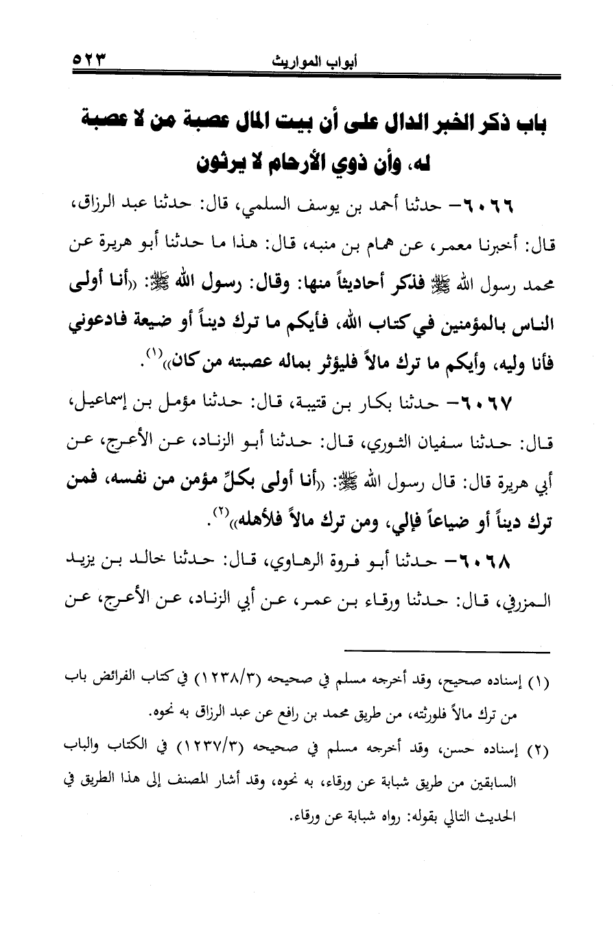 6067 - حدثنا بكار بن قتيبة، قال: حدثنا مؤمل بن إسماعيل، قال: حدثنا سفيان الثوري، قال: حدثنا أبو الزناد، عن الأعرج، عن أبي هريرة قال: قال رسول الله صلى الله عليه وسلم: "أنا أولى بكلِّ مؤمن من نفسه، فمن ترك دينًا أو ضياعًا فإلي، ومن ترك مالًا فلأهله" (¬1).