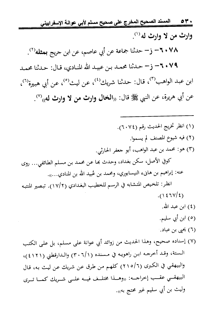 6079 - ز - حدثنا محمد بن عبيد الله المنادي، قال: حدثنا محمد ابن عبد الواهب (¬1)، قال: حدثنا شريك (¬2)، عن ليث (¬3)، عن أبي هبيرة (¬4)، عن أبي هريرة، عن النبي صلى الله عليه وسلم قال: "الخال وارث من لا وارث له" (¬5).