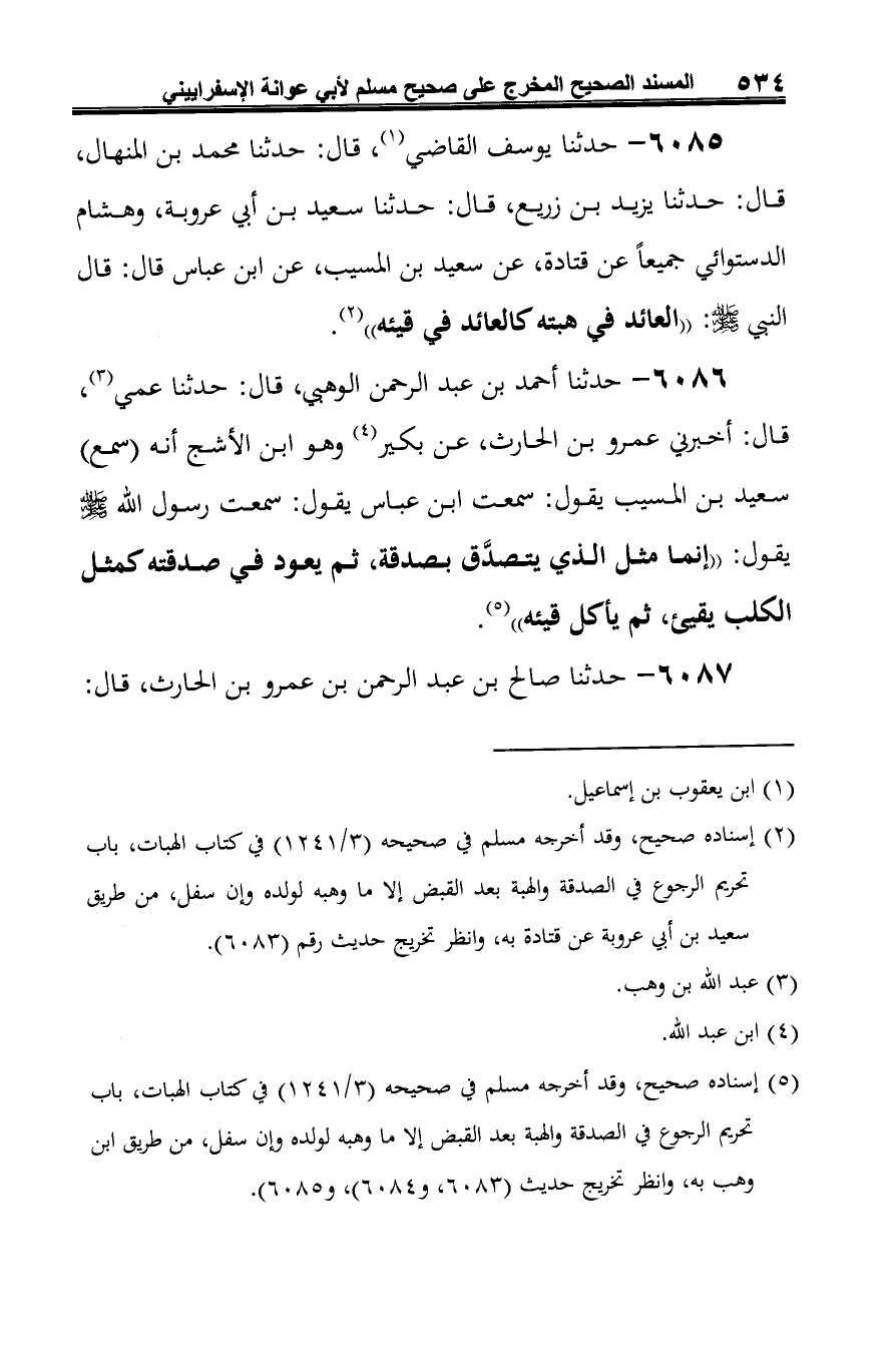 6085 - حدثنا يوسف القاضي (¬1)، قال: حدثنا محمد بن المنهال، قال: حدثنا يزيد بن زريع، قال: حدثنا سعيد بن أبي عروبة، وهشام الدستوائي جميعًا عن قتادة، عن سعيد بن المسيب، عن ابن عباس قال: قال النبي صلى الله عليه وسلم: "العائد في هبته كالعائد في قيئه" (¬2).