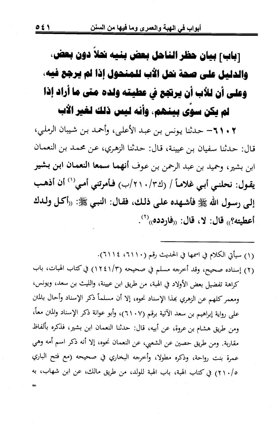6102 - حدثنا يونس بن عبد الأعلى، وأحمد بن شيبان الرملي، قال: حدثنا سفيان بن عيينة، قال: حدثنا الزهري، عن محمد بن النعمان ابن بشير، وحميد بن عبد الرحمن بن عوف أنهما سمعا النعمان ابن بشير يقول: نحلني أبي غلامًا فأمرتني أمي (¬1) أن أذهب إلى رسول الله -صلى الله عليه وسلم- فأشهده على ذلك، فقال: النبي صلى الله عليه وسلم: "أكل ولدك أعطيته؟ " قال: لا، قال: "فاردده" (¬2).