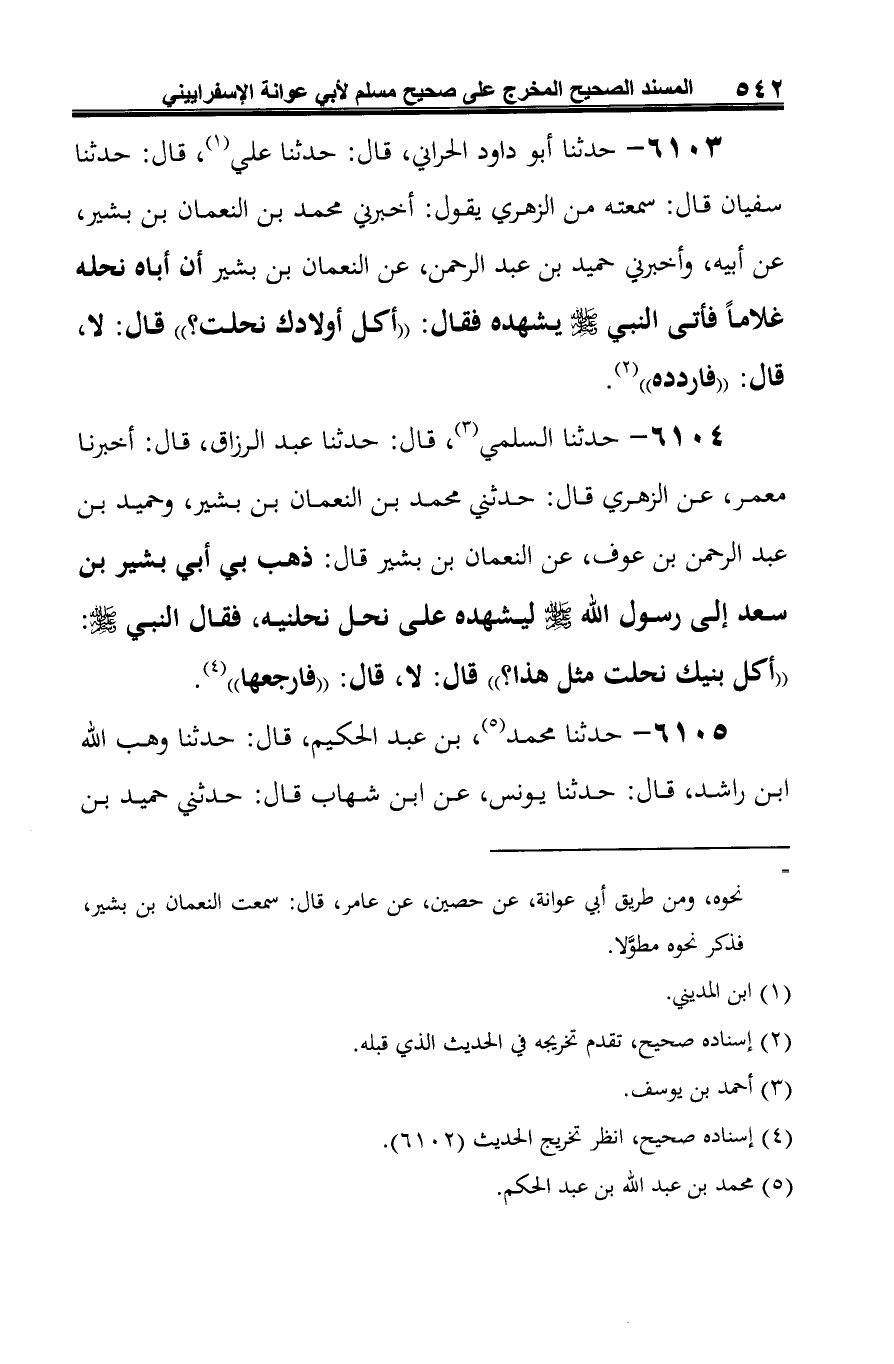 6104 - حدثنا السلمي (¬1)، قال: حدثنا عبد الرزاق، قال: أخبرنا معمر، عن الزهري قال: حدثني محمد بن النعمان بن بشير، وحميد بن عبد الرحمن بن عوف، عن النعمان بن بشير قال: ذهب بي أبي بشير بن سعد إلى رسول الله صلى الله عليه وسلم ليشهده على نحل نحلنيه، فقال النبي صلى الله عليه وسلم: "أكل بنيك نحلت مثل هذا؟ " قال: لا، قال: " فارجعها" (¬2).