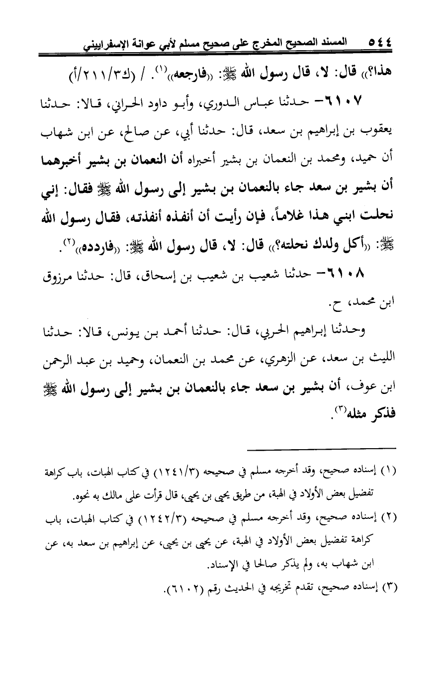 6107 - حدثنا عباس الدوري، وأبو داود الحراني، قالا: حدثنا يعقوب بن إبراهيم بن سعد، قال: حدثنا أبي، عن صالح، عن ابن شهاب أن حميد، ومحمد بن النعمان بن بشير أخبراه أن النعمان بن بشير أخبرهما أن بشير بن سعد جاء بالنعمان بن بشير إلى رسول الله صلى الله عليه وسلم فقال: إني نحلت ابني هذا غلامًا، فإن رأيت أن أنفذه أنفذته، فقال رسول الله صلى الله عليه وسلم: "أكل ولدك نحلته؟ " قال: لا، قال رسول الله صلى الله عليه وسلم: "فاردده" (¬1).