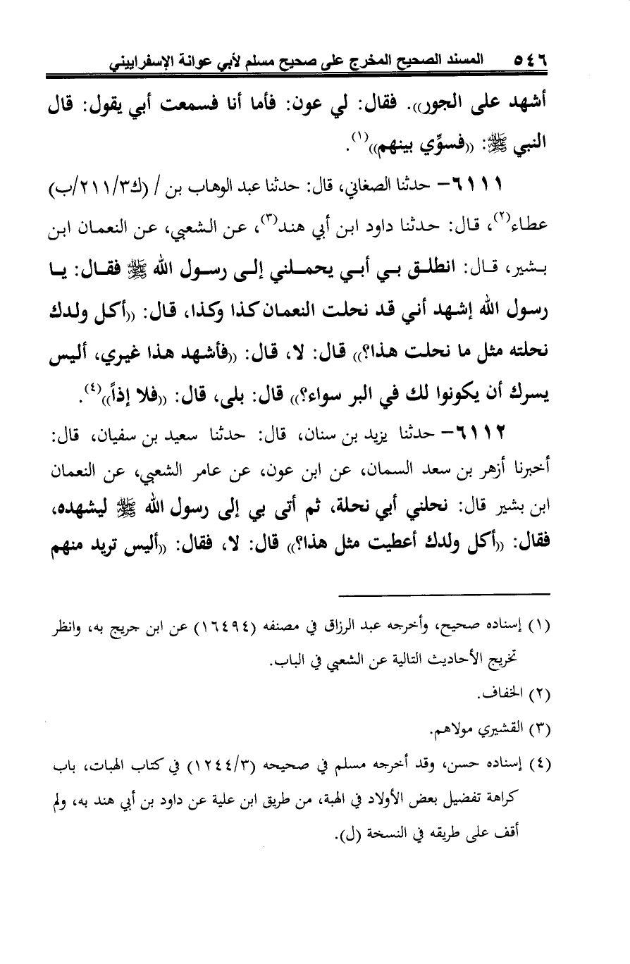 (¬3) إسناده حسن، وقد أخرجه مسلم في صحيحه (3/ 1244) في كتاب الهبات، باب كراهة تفضيل بعض الأولاد في الهبة، من طريق ابن علية عن داود بن أبي هند به، ولم أقف على طريقه في النسخة (ل).
