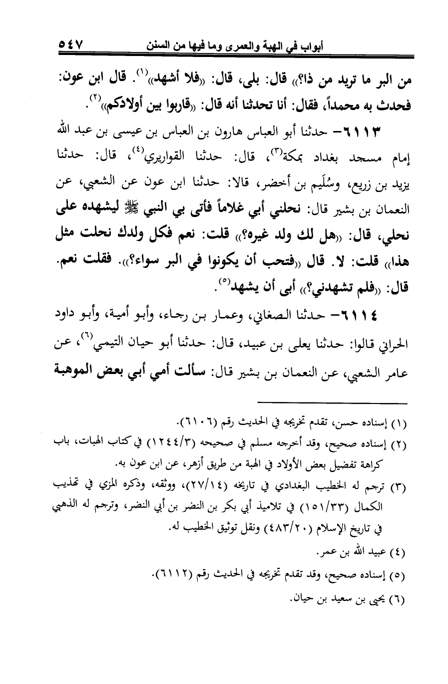 6113 - حدثنا أبو العباس هارون بن العباس بن عيسى بن عبد الله إمام مسجد بغداد بمكة (¬1)، قال: حدثنا القواريري (¬2)، قال: حدثنا يزيد بن زريع، وسُلَيم بن أخضر، قالا: حدثنا ابن عون عن الشعبي، عن النعمان بن بشير قال: نحلني أبي غلامًا فأتى بي النبي صلى الله عليه وسلم ليشهده على نحلي، قال: "هل لك ولد غيره؟ " قلت: نعم فكل ولدك نحلت مثل هذا" قلت: لا. قال "فتحب أن يكونوا في البر سواء؟ ". فقلت نعم. قال: "فلم تشهدني؟ " أبى أن يشهد (¬3).