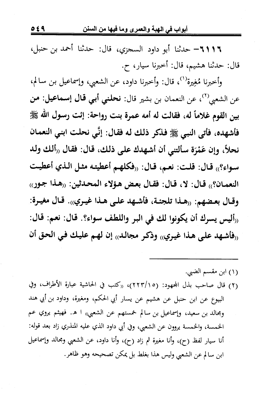 وأخبرنا مُغِيرة (¬1)، قال: وأخبرنا داود، عن الشعبي، وإسماعيل بن سالم، عن الشعبي (¬2)، عن النعمان بن بشير قال: نحلني أبي قال إسماعيل: من بين القوم غلامًا له، فقالت له أمه عمرة بنت رواحة: ائت رسول الله صلى الله عليه وسلم فأشهده، فأتى النبي صلى الله عليه وسلم فذكر ذلك له فقال: إنَّي نحلت ابني النعمان نحلًا، وإن عَمْرَة سألتني أن أشهدك على ذلك، قال: فقال "ألك ولد سواء؟ " قال: قلت: نعم، قال: "فكلهم أعطيته مثل الذي أعطيت النعمان؟ " قال: لا، قال: فقال بعض هؤلاء المحدثين: "هذا جور" وقال بعضهم: "هذا تلجئة، فأشهد على هذا غيري". قال مغيرة: "أليس يسرك أن يكونوا لك في البر واللطف سواء؟. قال: نعم: قال: "فأشهد على هذا غيري" وذكر مجالد" إن لهم عليك في الحق أن