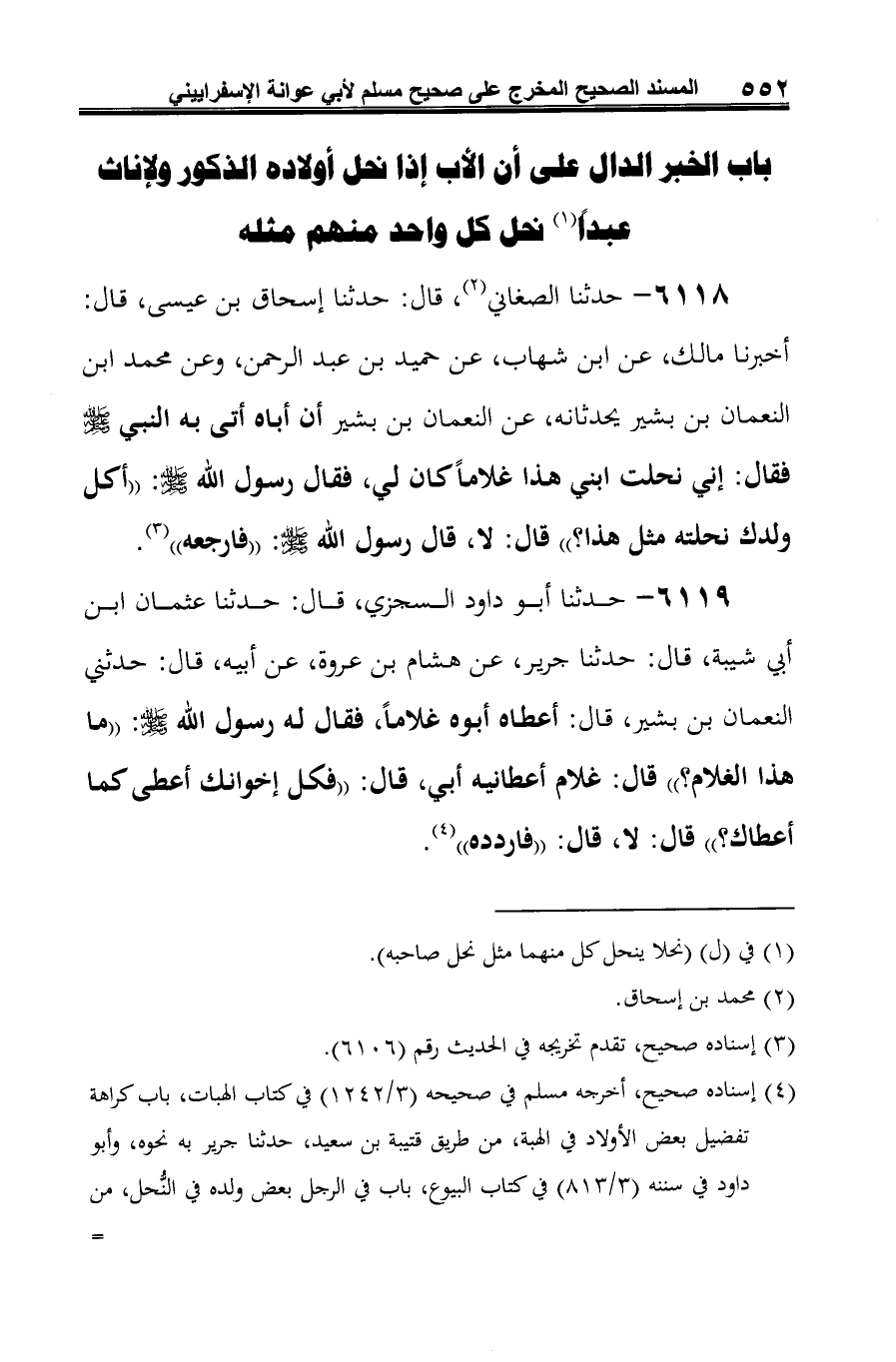 6119 - حدثنا أبو داود السجزي، قال: حدثنا عثمان ابن أبي شيبة، قال: حدثنا جرير، عن هشام بن عروة، عن أبيه، قال: حدثني النعمان بن بشير، قال: أعطاه أبوه غلامًا، فقال له رسول الله صلى الله عليه وسلم: "ما هذا الغلام؟ " قال: غلام أعطانيه أبي، قال: "فكل إخوانك أعطى كما أعطاك؟ " قال: لا، قال: "فاردده" (¬1).