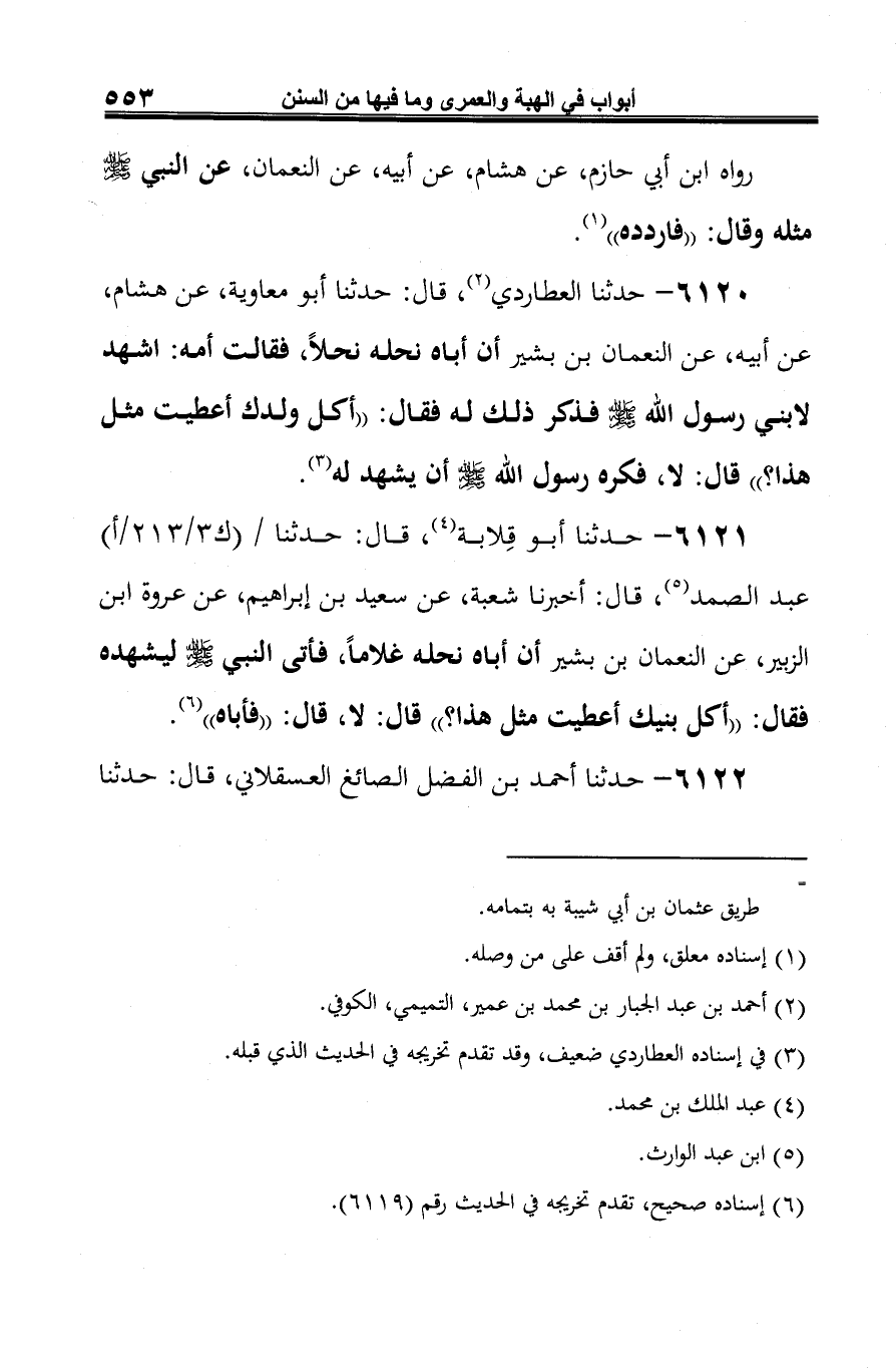 6120 - حدثنا العطاردي (¬1)، قال: حدثنا أبو معاوية، عن هشام، عن أبيه، عن النعمان بن بشير أن أباه نحله نحلًا، فقالت أمه: اشهد لابني رسول الله صلى الله عليه وسلم فذكر ذلك له فقال: "أكل ولدك أعطيت مثل هذا؟ " قال: لا، فكره رسول الله صلى الله عليه وسلم أن يشهد له (¬2).