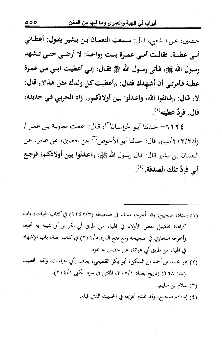 6124 - حدثنا أبو خُراسان (¬1)، قال: سمعت معاوية بن عمر، قال: حدثنا أبو الأحوص (¬2) عن حصين، عن عامر، عن النعمان بن بشير قال: قال رسول الله صلى الله عليه وسلم: "اعدلوا بين أولادكم؛ فرجع أبي فردَّ تلك الصدقة" (¬3).