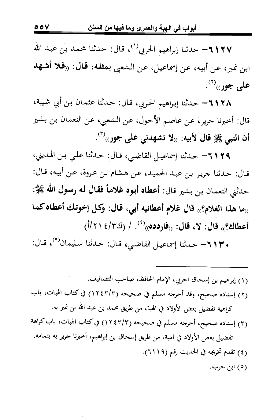 6127 - حدثنا إبراهيم الحربي (¬1)، قال: حدثنا محمد بن عبد الله ابن نمير، عن أبيه، عن إسماعيل، عن الشعبي بمثله، قال: "فلا أشهد على جور" (¬2).