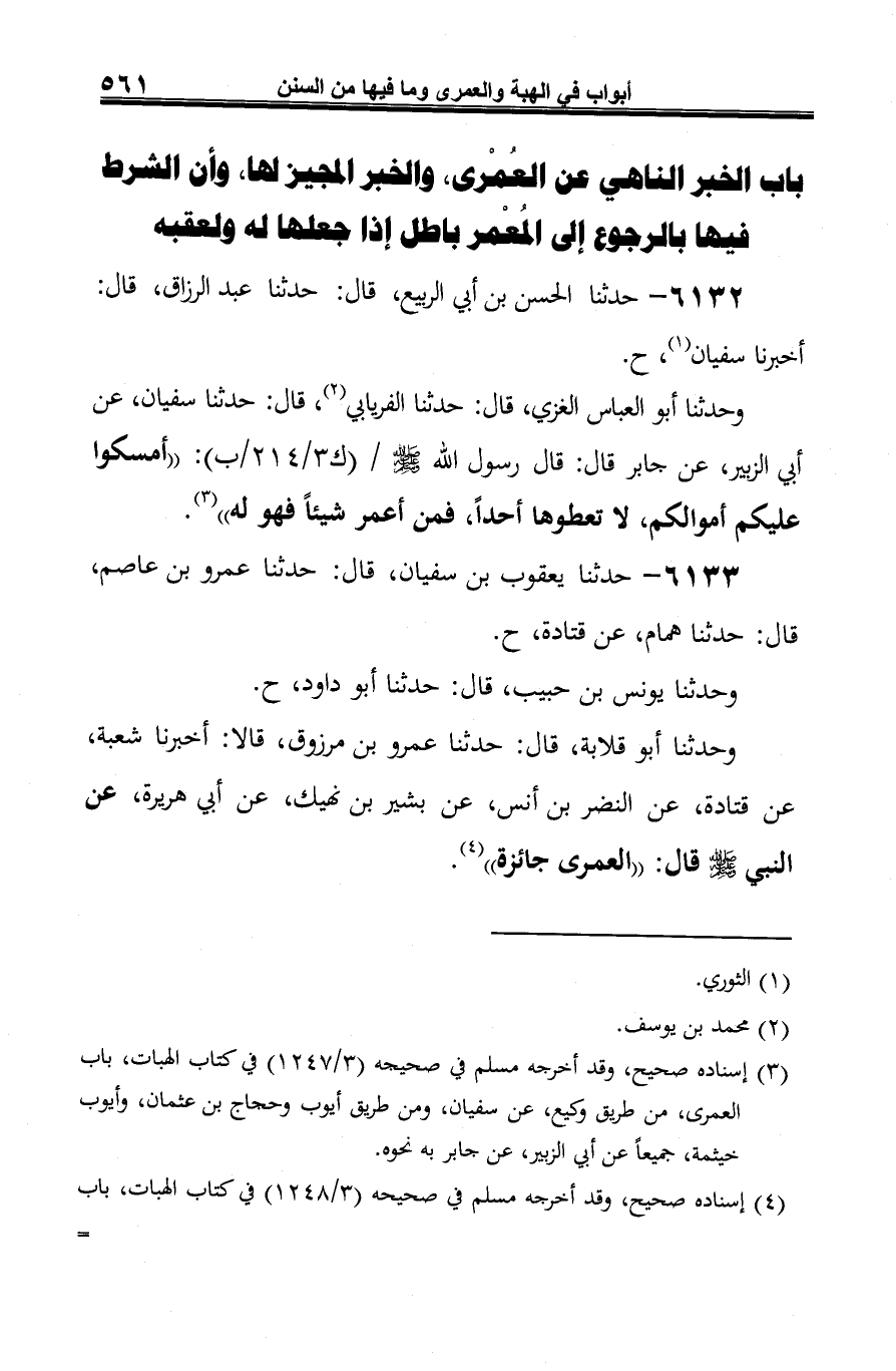 (¬3) إسناده صحيح، وقد أخرجه مسلم في صحيحه (3/ 1247) في كتاب الهبات، باب العمرى، من طريق وكيع، عن سفيان، ومن طريق أيوب وحجاج بن عثمان، وأيوب خيثمة، جميعًا عن أبي الزبير، عن جابر به نحوه.