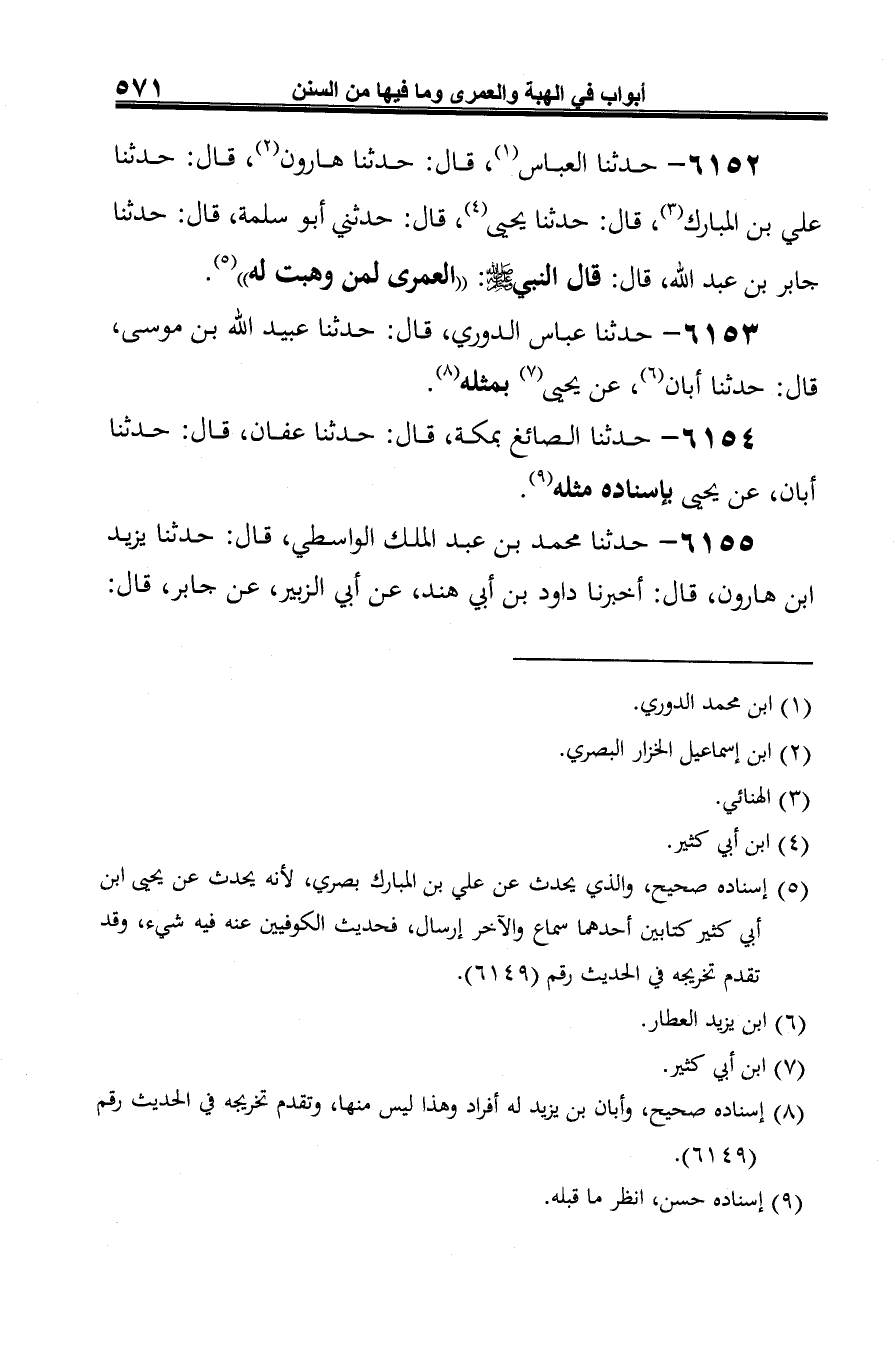 6152 - حدثنا العباس (¬1)، قال: حدثنا هارون (¬2)، قال: حدثنا علي بن المبارك (¬3)، قال: حدثنا يحيى (¬4)، قال: حدثني أبو سلمة، قال: حدثنا جابر بن عبد الله، قال: قال النبي صلى الله عليه وسلم: "العمرى لمن وهبت له" (¬5).