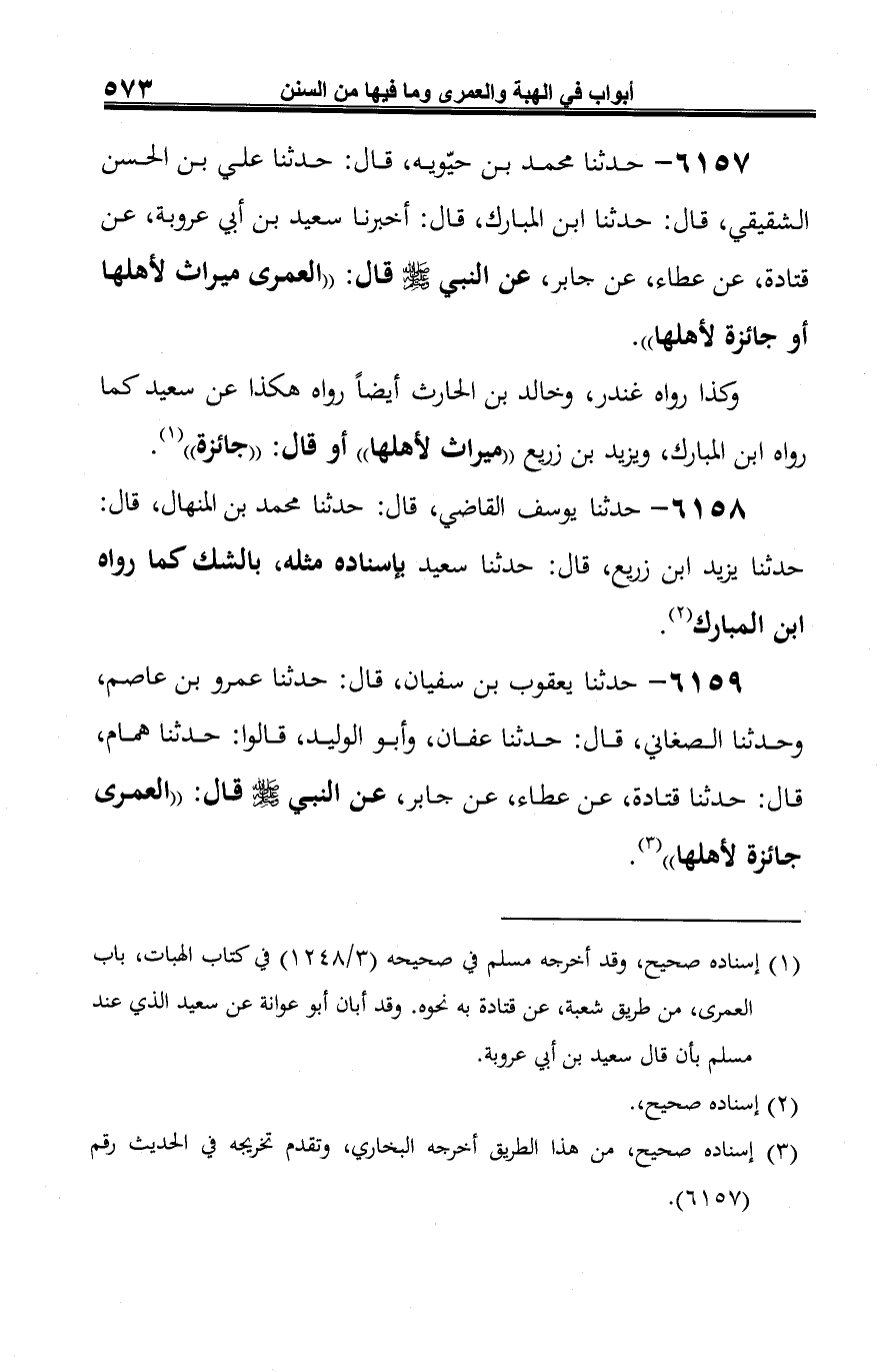 6157 - حدثنا محمد بن حيّويه، قال: حدثنا علي بن الحسن الشقيقي، قال: حدثنا ابن المبارك، قال: أخبرنا سعيد بن أبي عروبة، عن قتادة، عن عطاء، عن جابر، عن النبي صلى الله عليه وسلم قال: "العمرى ميراث لأهلها أو جائزة لأهلها".