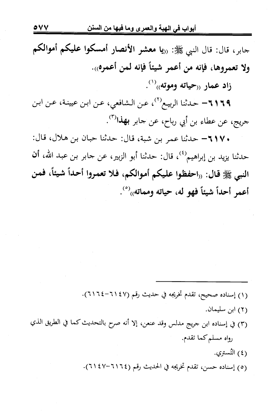 6170 - حدثنا عمر بن شبة، قال: حدثنا حبان بن هلال، قال: حدثنا يزيد بن إبراهيم (¬1)، قال: حدثنا أبو الزبير، عن جابر بن عبد الله، أن النبي -صلى الله عليه وسلم- قال: "احفظوا عليكم أموالكم، فلا تعمروا أحدًا شيئًا، فمن أعمر أحدًا شيئًا فهو له، حياته ومماته" (¬2).