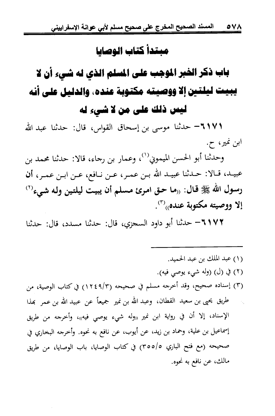 وحدثنا أبو الحسن الميموني (¬1)، وعمار بن رجاء، قالا: حدثنا محمد بن عبيد، قالا: حدثنا عبيد الله بن عمر، عن نافع، عن ابن عمر، أن رسول الله صلى الله عليه وسلم قال: "ما حق امرئ مسلم أن يبيت ليلتين وله شيء (¬2) إلا ووصيته مكتوبة عنده" (¬3).