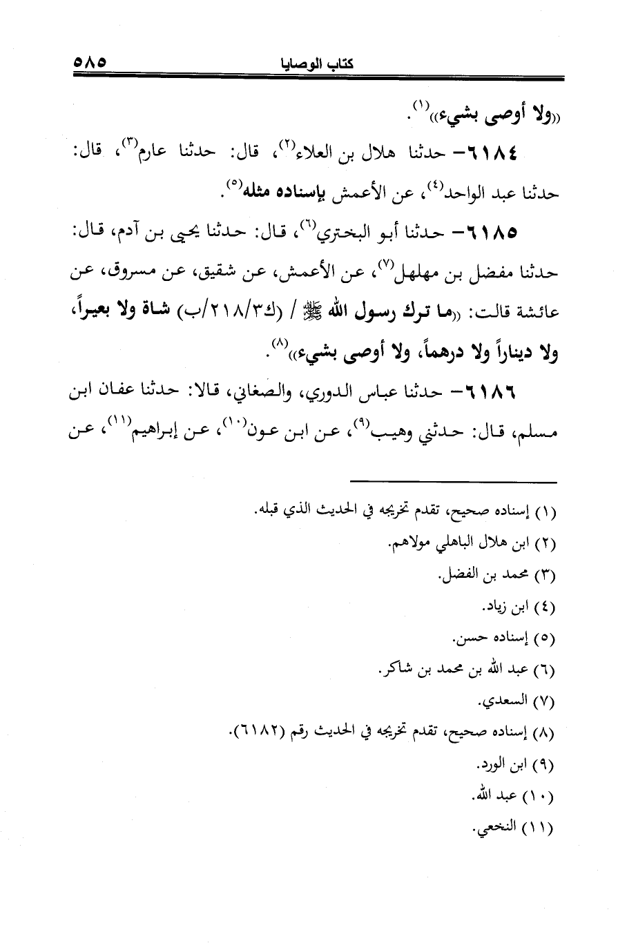 6185 - حدثنا أبو البختري (¬1)، قال: حدثنا يحيى بن آدم، قال: حدثنا مفضل بن مهلهل (¬2)، عن الأعمش، عن شقيق، عن مسروق، عن عائشة قالت: "ما ترك رسول الله صلى الله عليه وسلم شاة ولا بعيرًا، ولا دينارًا ولا درهمًا، ولا أوصى بشيء" (¬3).