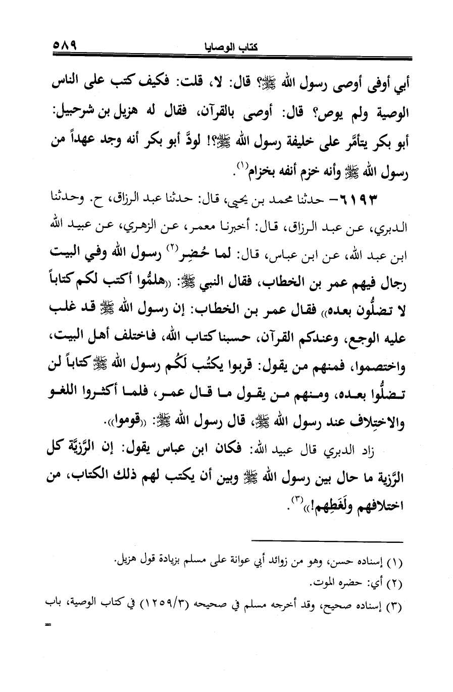 6193 - حدثنا محمد بن يحيى، قال: حدثنا عبد الرزاق، ح. وحدثنا الدبري، عن عبد الرزاق، قال: أخبرنا معمر، عن الزهري، عن عبيد الله ابن عبد الله، عن ابن عباس، قال: لما حُضِر (¬1) رسول الله وفي البيت رجال فيهم عمر بن الخطاب، فقال النبي صلى الله عليه وسلم: "هلمُّوا أكتب لكم كتابًا لا تضلُّون بعده" فقال عمر بن الخطاب: إن رسول الله صلى الله عليه وسلم قد غلب عليه الوجع، وعندكم القرآن، حسبنا كتاب الله، فاختلف أهل البيت، واختصموا، فمنهم من يقول: قربوا يكتُب لَكُم رسول الله صلى الله عليه وسلم كتابًا لن تضلُّوا بعده، ومنهم من يقول ما قال عمر، فلما أكثروا اللغو والاختِلاف عند رسول الله صلى الله عليه وسلم، قال رسول الله صلى الله عليه وسلم: "قوموا".