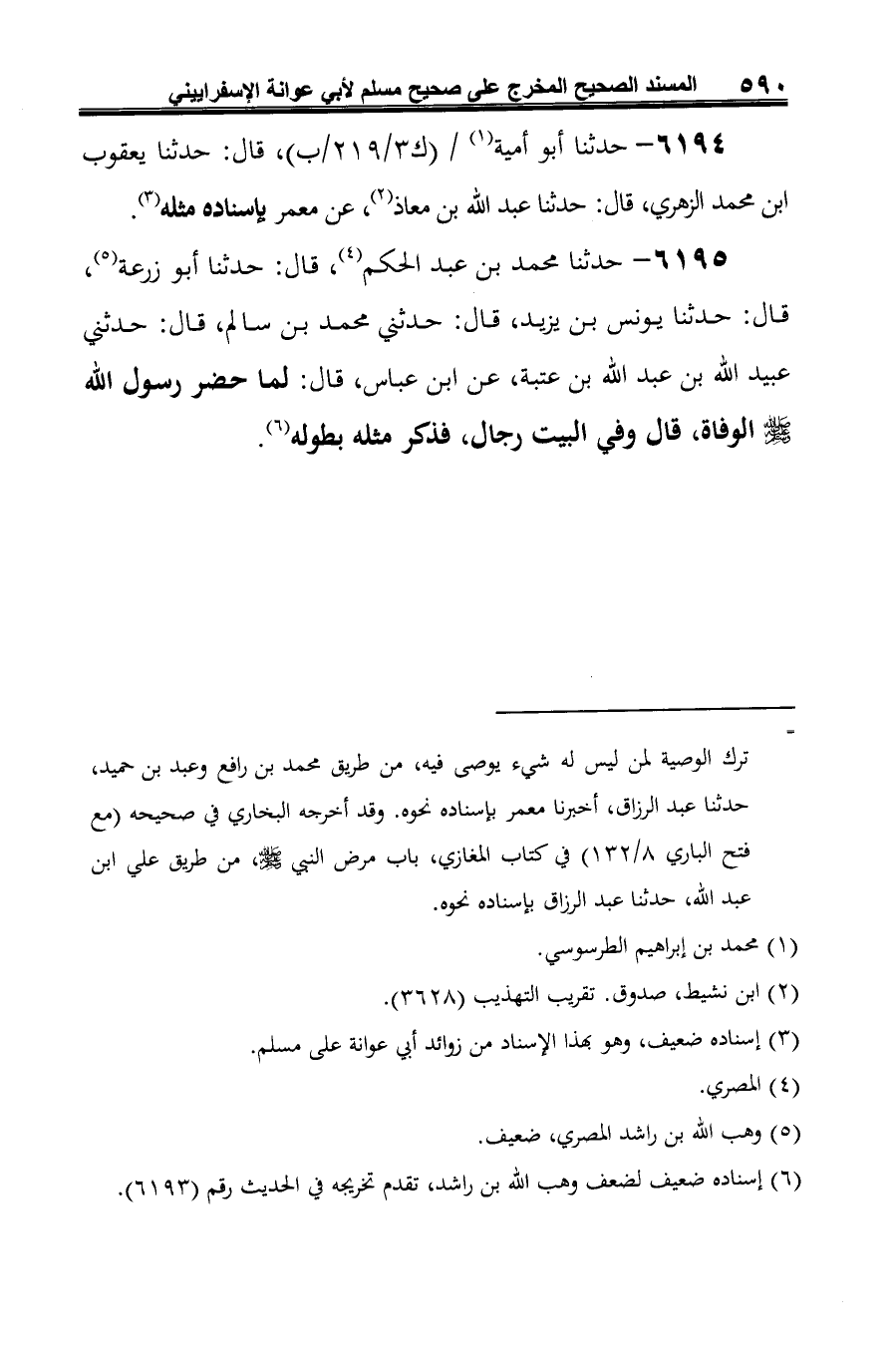 6195 - حدثنا محمد بن عبد الحكم (¬1)، قال: حدثنا أبو زرعة (¬2)، قال: حدثنا يونس بن يزيد، قال: حدثني محمد بن سالم، قال: حدثني عبيد الله بن عبد الله بن عتبة، عن ابن عباس، قال: لما حضر رسول الله صلى الله عليه وسلم الوفاة، قال وفي البيت رجال، فذكر مثله بطوله (¬3).