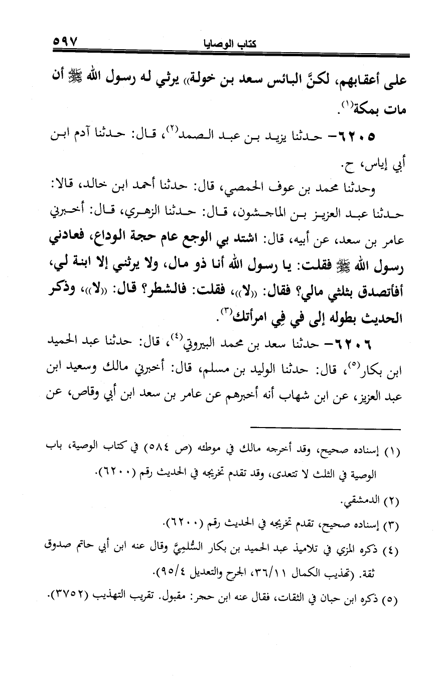 6206 - حدثنا سعد بن محمد البيروتي (¬1)، قال: حدثنا عبد الحميد ابن بكار (¬2)، قال: حدثنا الوليد بن مسلم، قال: أخبرني مالك وسعيد ابن عبد العزيز، عن ابن شهاب أنه أخبرهم عن عامر بن سعد ابن أبي وقاص، عن